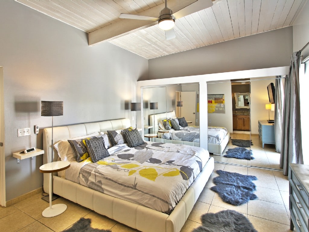 The master suite features a king bed and en suite bathroom with a huge shower stall. The second bedroom in the house has a queen bed, and shares a bathroom with the third bedroom (with two twin beds). The detached casita has a queen bed and en suite bathroom, with direct pool access.