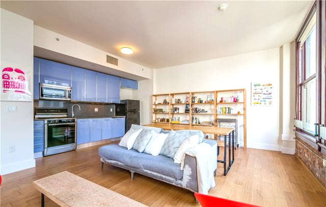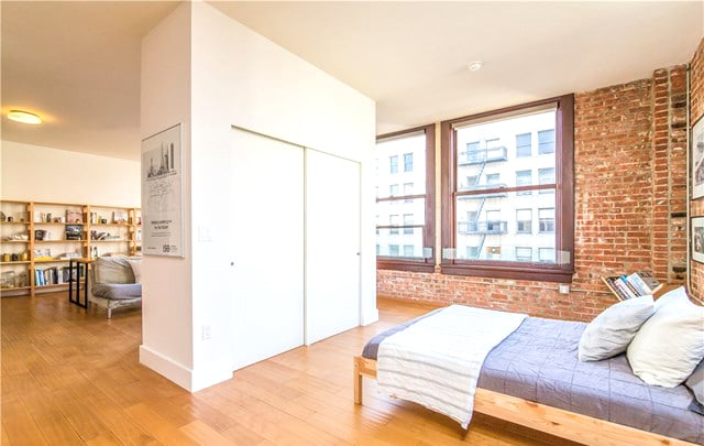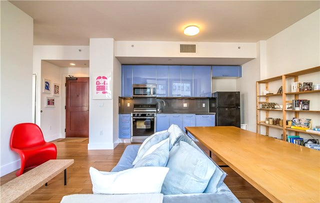 The unit itself is beautiful and sun-drenched, with 10 ft ceilings, exposed brick walls, a large modern kitchen and AMAZING views down Spring Street all the way to the snow capped mountains. There’s also a nice separated area for the bedroom space, and in-unit laundry as well.