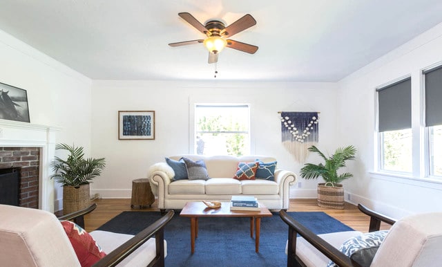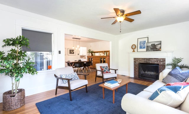 Inside, a bright and warm living room welcomes you. Featuring a working fireplace and hardwood floors that flow through to the dining.