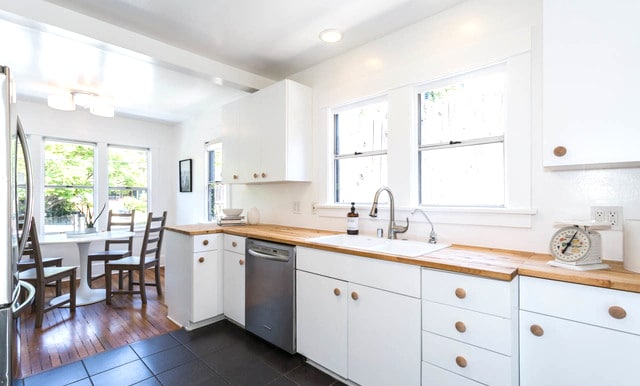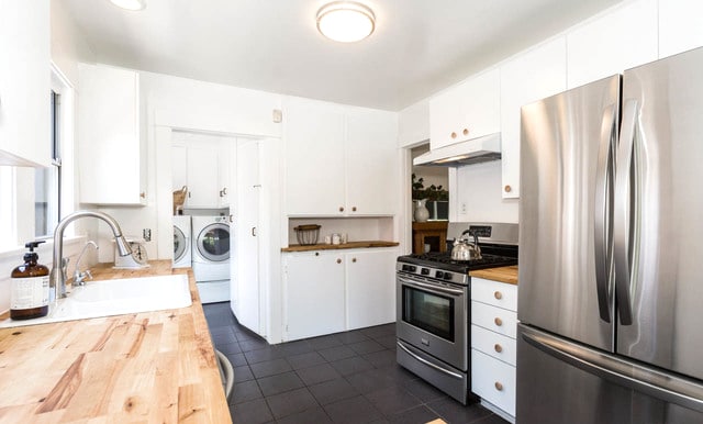 Super charming kitchen boasts white cabinetry, butcher block countertops, stainless steel appliances and a breakfast nook. Off the kitchen there’s also a laundry room that features additional storage.