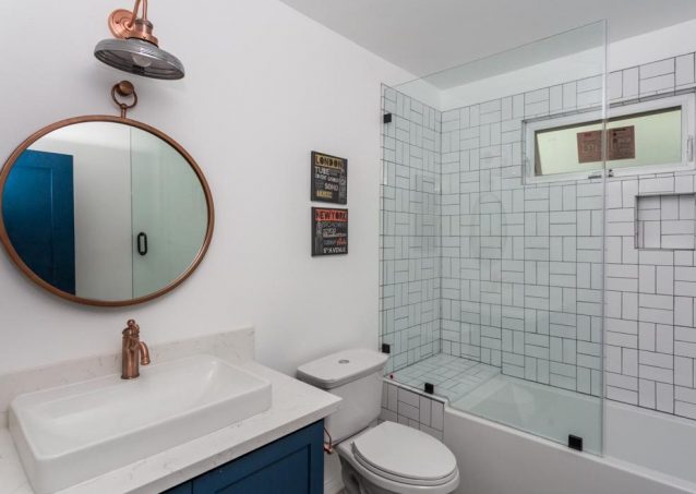 The pop in this bathroom wasn’t just the tile but the overall collection of trendy and stylish deep blue shaker cabinetry, vessel sink and cooper finishes.