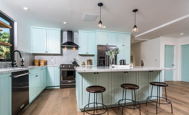 We can’t help but think of mint chocolate chip ice cream, while dancing it out in this kitchen. What a cool place to create some of the most refreshing treats for the family while listening to your favorite tunes, spatula in hand.