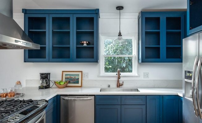 Inspired much? We bet our cookie batter dough that someone is going to make a whole lotta family recipes in this kitchen. We absolutely love the modern blue classic shaker with glass cabinetry and brass finishes in this kitchen.