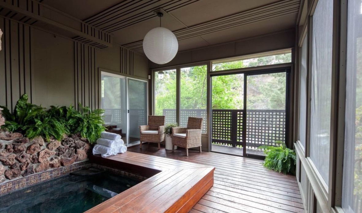 Family room with hardwood floors opens to private screened in spa grotto that opens to outdoor patio & lush landscaping. Family room could also be a 2nd Master Suite.