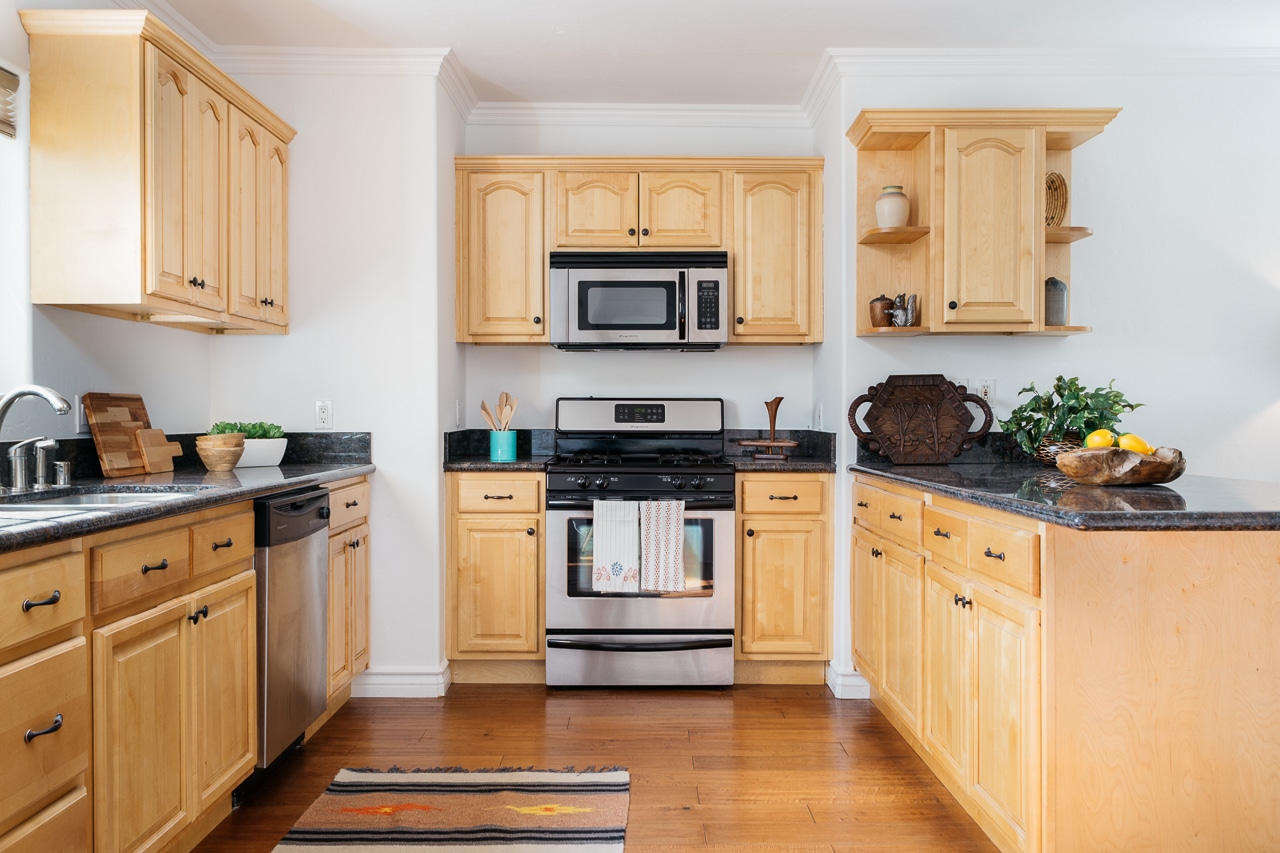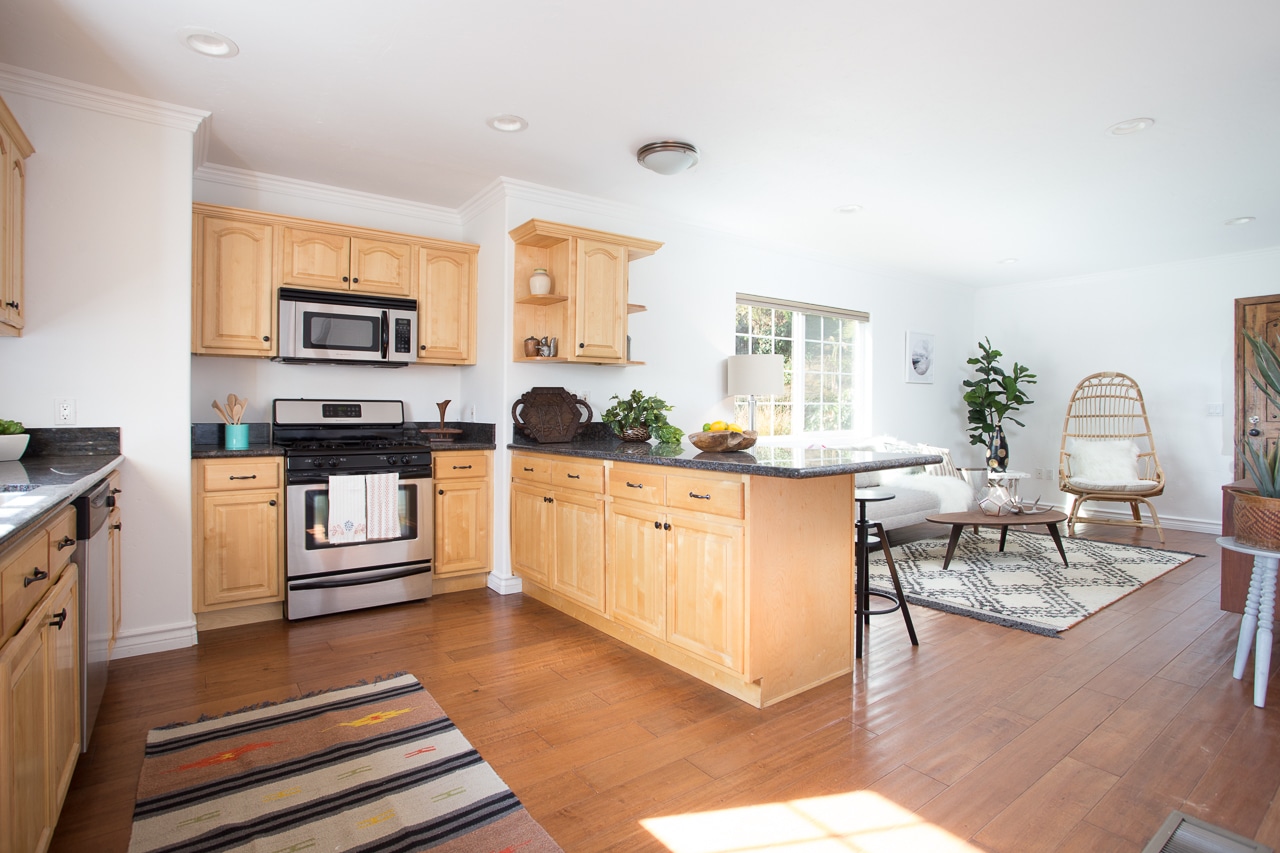 The freshly painted living room boasts updated windows, hardwood floors, and open space, leading to an updated kitchen with granite counters, wood cabinets and tons of storage.