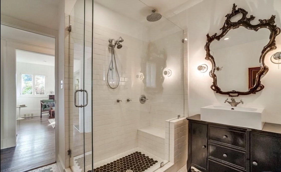 This bathroom is boasting with character and displays a beautiful play on the traditional black and white. The bathroom features a beautifully decorative bathroom mirror, farmhouse sink, chrome hardware and fixtures, a handheld shower system along with a calming and soothing overhead rain shower head, the perfect addition to help you relax after a long day.
