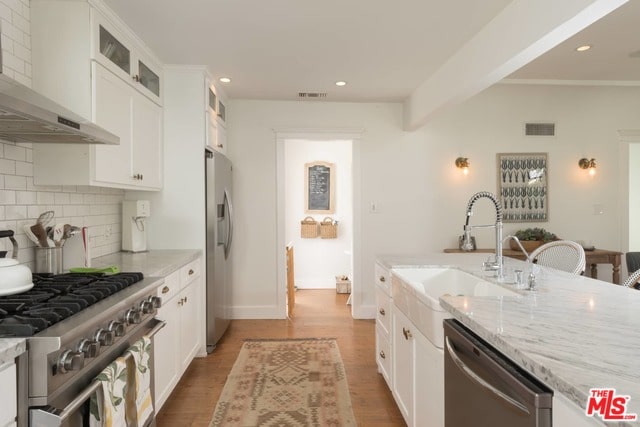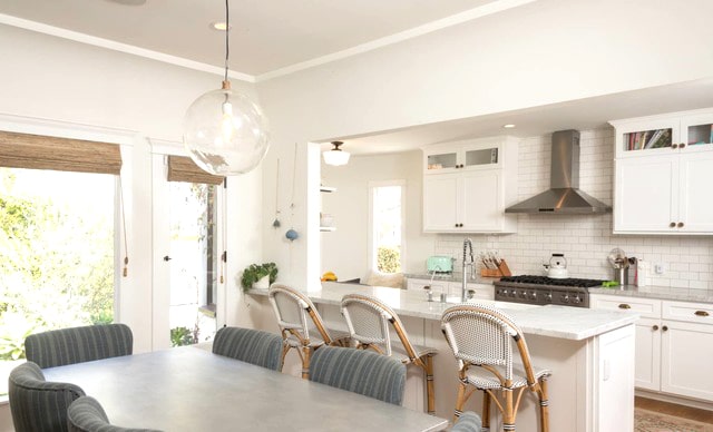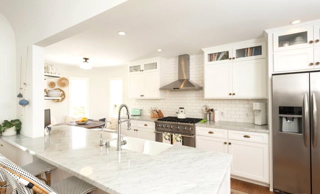 Kitchen is stunning, with marble countertops, high-rising subway backsplash, white shaker cabinetry, stainless steel appliances and an eat-in breakfast nook.