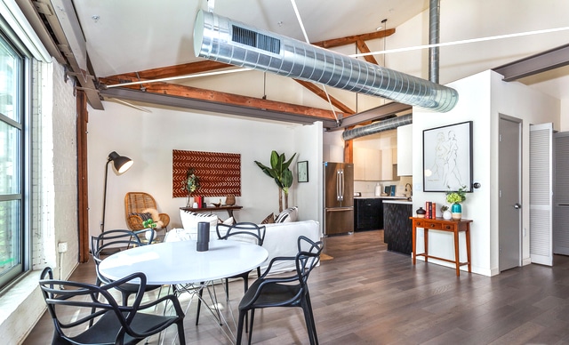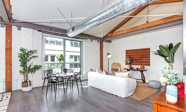 This fabulous top floor unit will blow your socks off with delicious industrial features like exposed brick, heavy timber beams and large factory-style windows. Love!