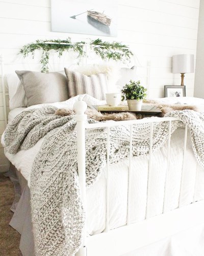 The coziness factor is one of the main reasons I can’t resist a beautiful wrought iron bed. Simply adds some soft white linens and a rustic nightstands to instantly transform your bedroom into a cozy haven.