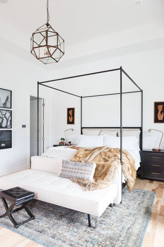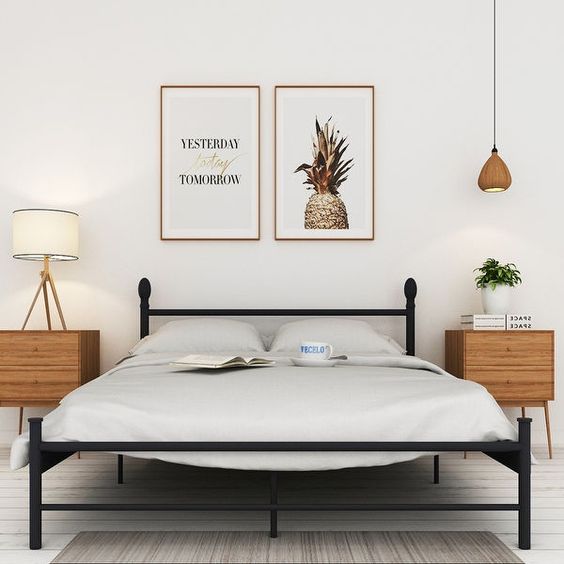 The minimalist nature of a simple wrought iron bed makes the art and mirrors in a room really pop. Anything with a little shine will stand out. Just be sure to match the frames with the duvet or blanket on the bed.