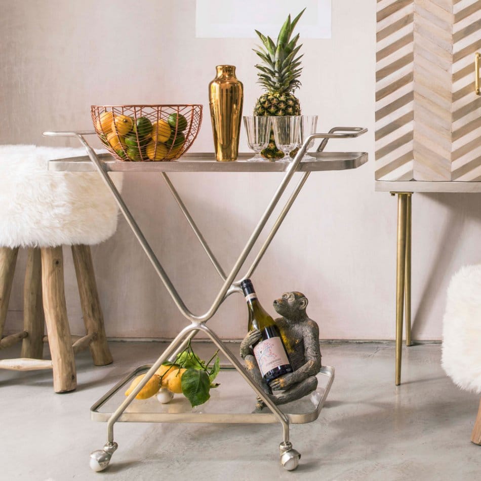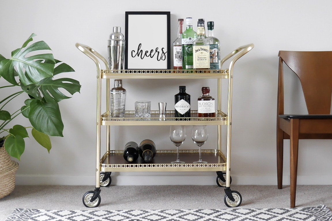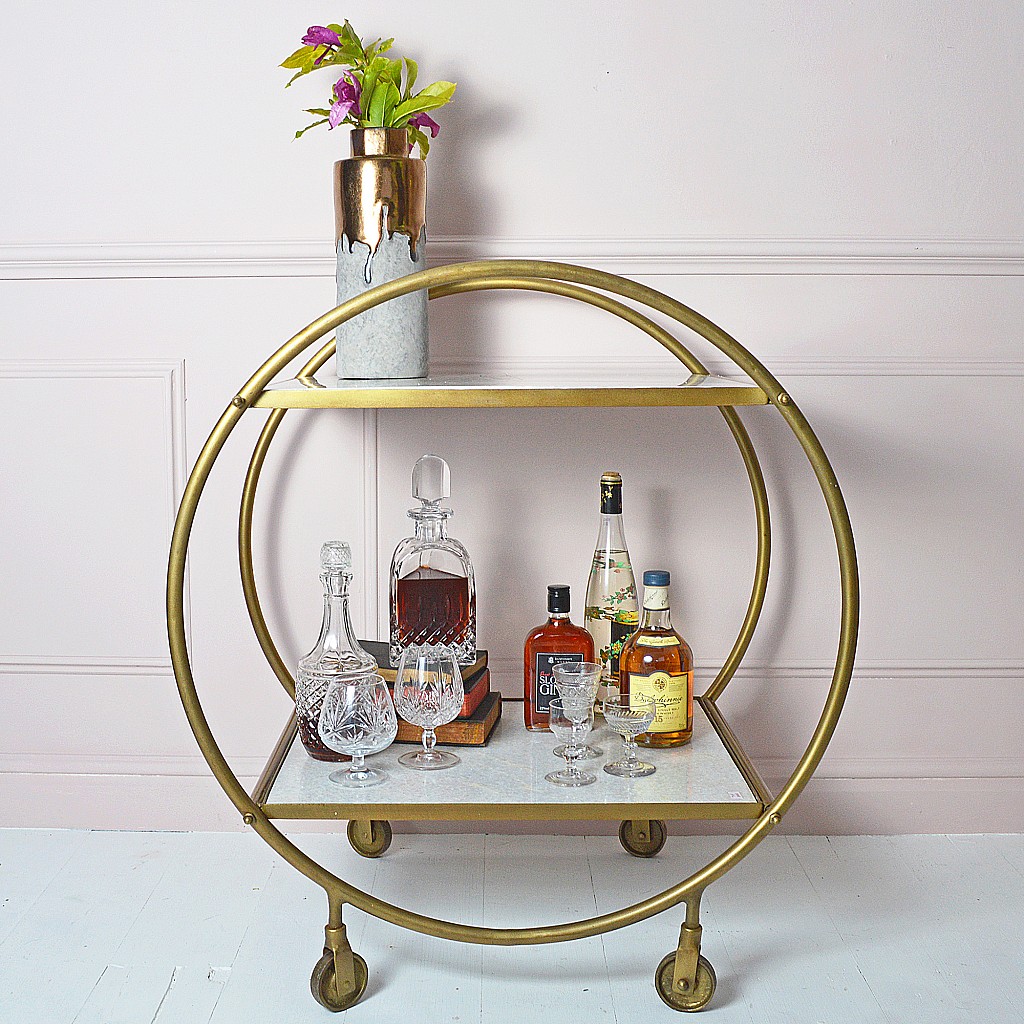 Retro-style carts are particularly popular – think gold and glitzy with glass or marble shelving.