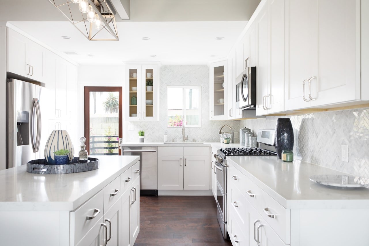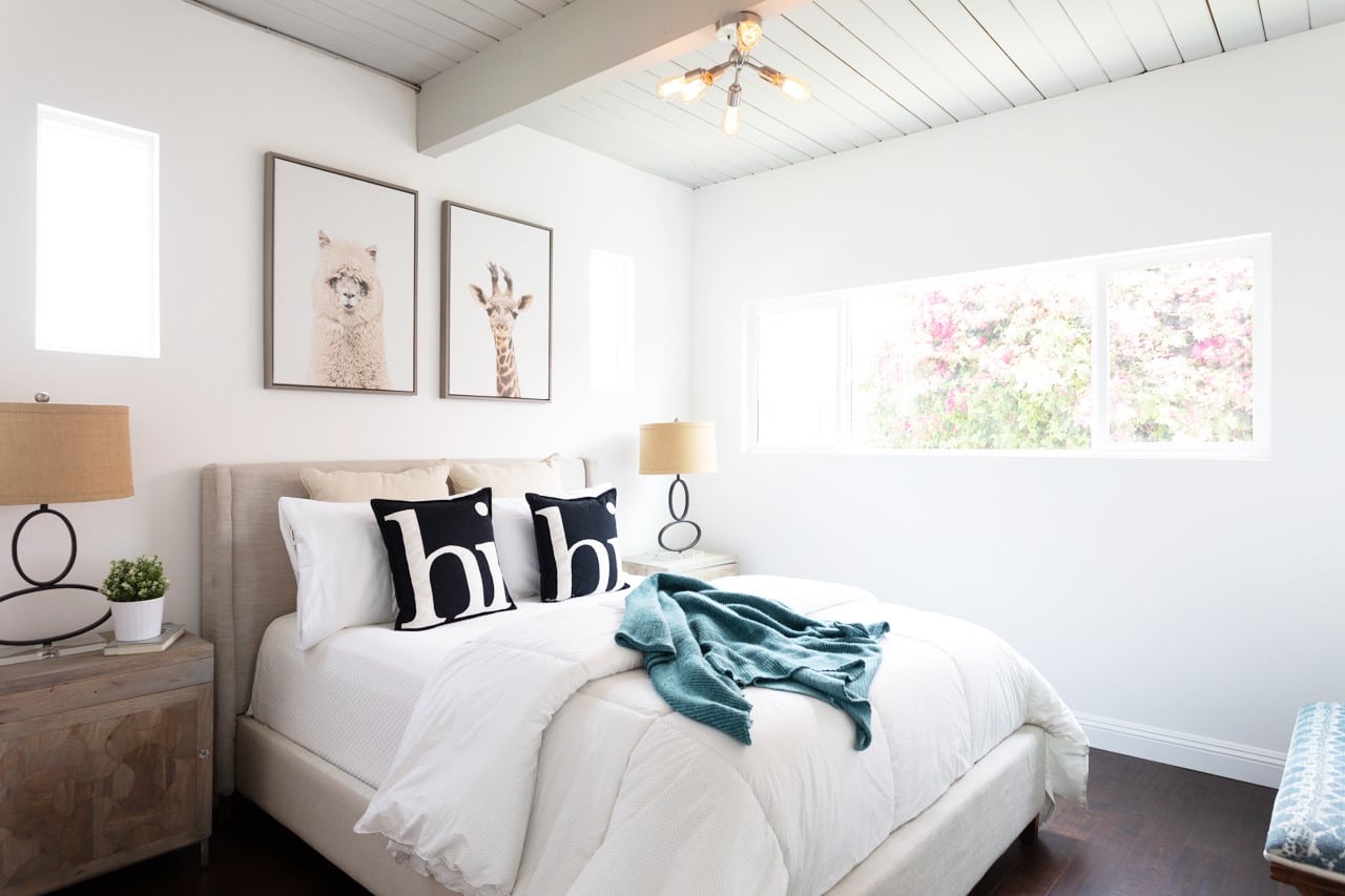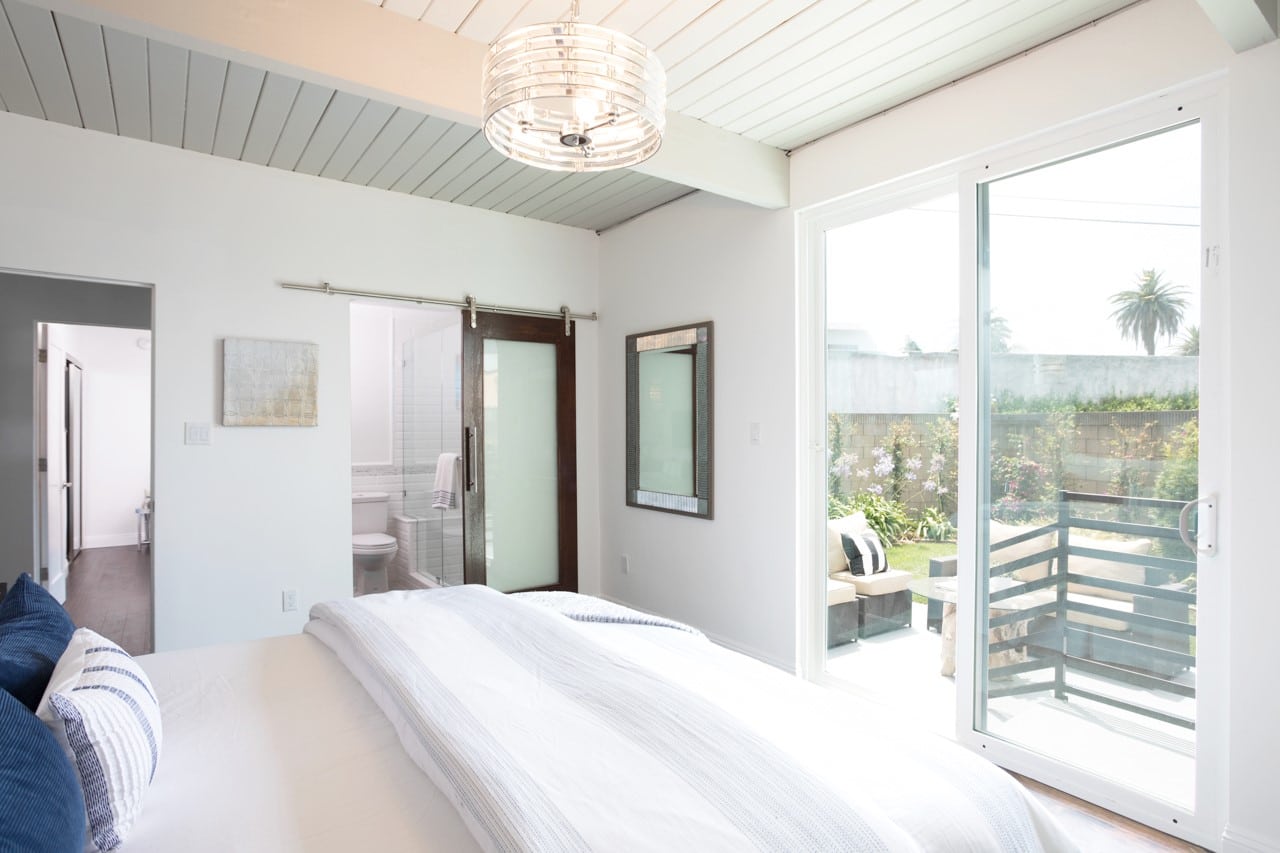 Huge master suite boasts custom closet, and all new glass sliders to rear yard, and sliding barn door to master bathroom featuring dual Carrara marble vanity with sparkling subway tile shower and new hardware.