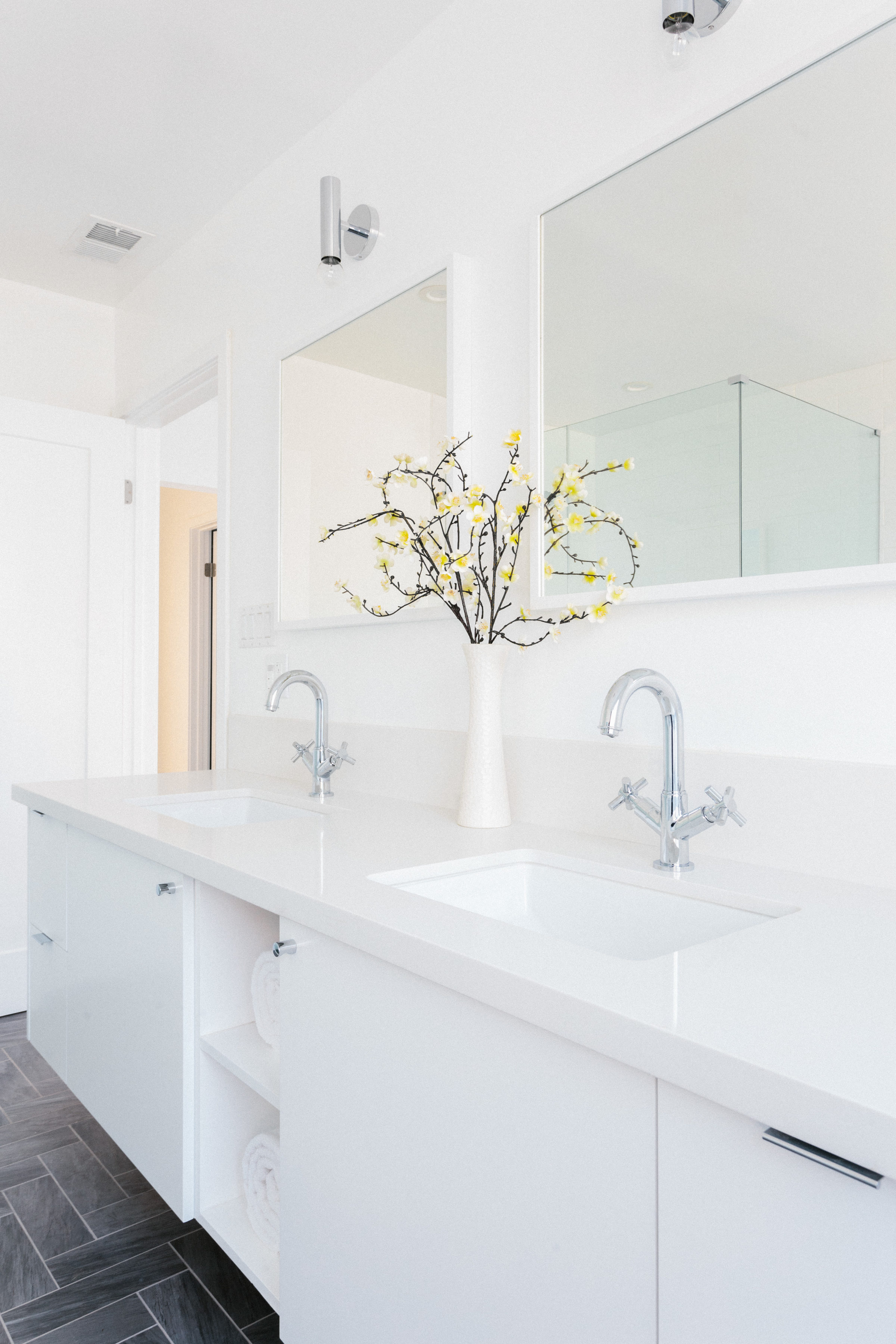 We love the use of really large square mirrors side by side. It enlarges the room and creates a clean and minimal space.