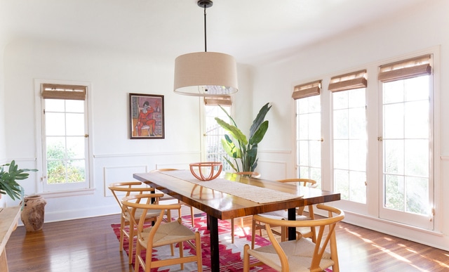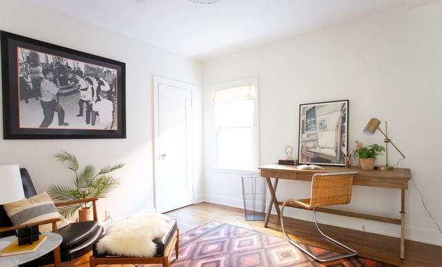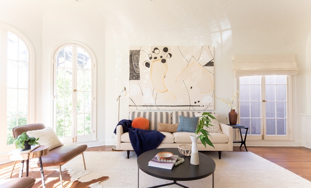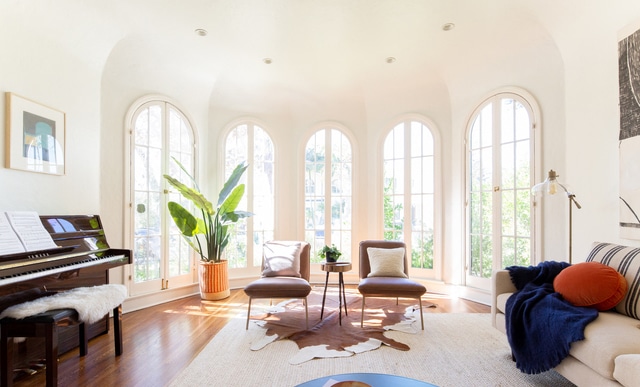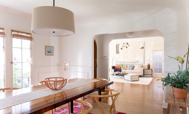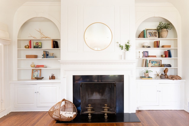 Inside, a bright spacious living room greets you and you instantly feel at home. Dramatic arched floor-to-ceiling windows, warm wood floors flow throughout, wonderful built-ins and a handsome fireplace anchors the space.