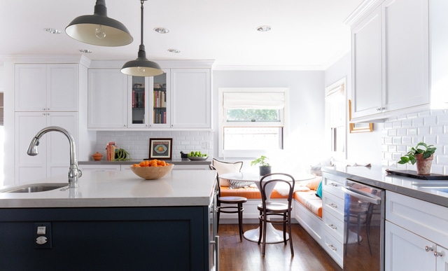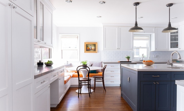 Through a wide archway you come upon a lovely dining room that leads to a walk-in pantry and a fabulously updated kitchen with large center island, stunning shaker cabinetry, stainless steel appliances and the cutest built-in breakfast nook.