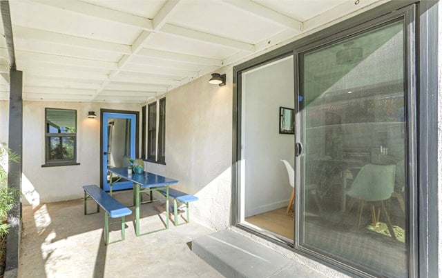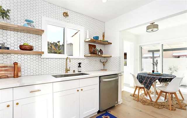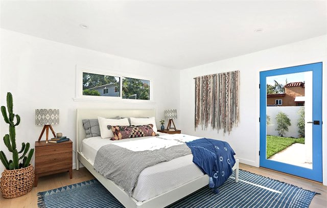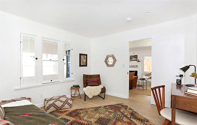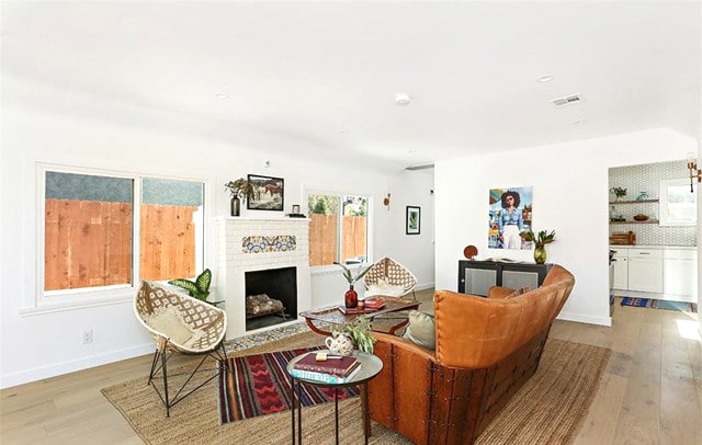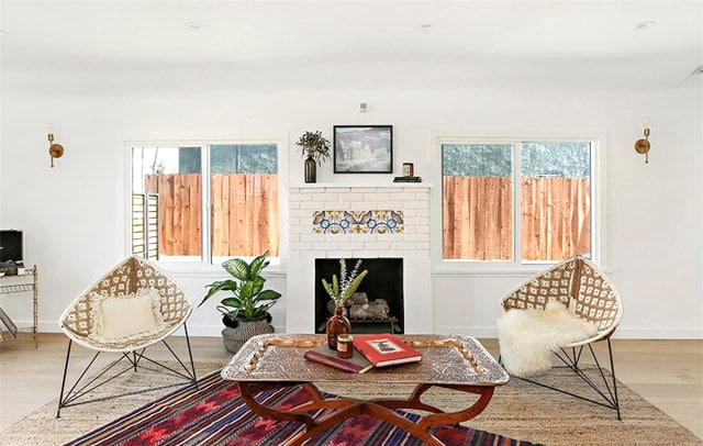 Inside, a bright white interior contrasts beautifully with the natural hues of the flooring. Plenty of windows bathe the space in tons of light, and a charming fireplace with Spanish tile detailing anchors the living room.