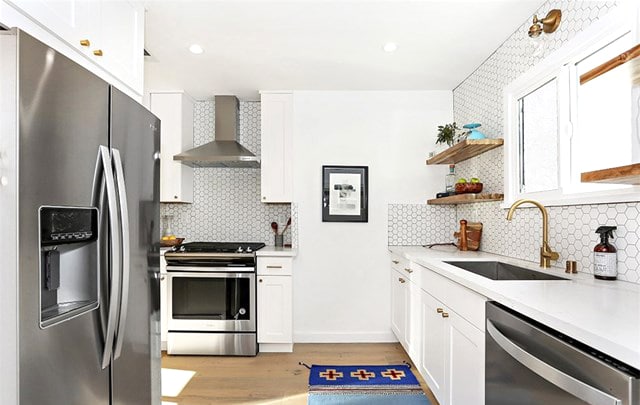 Kitchen is a dream, with beautiful white hex mosaic tiling, butcher block shelving, stainless steel appliances and natural brass accents.