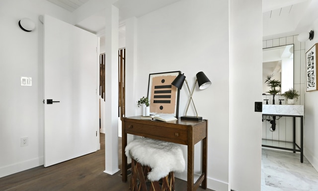 Main level also features a chic 1/2 bath with Nero Marquina marble backsplash and canyon views. Lower level features 2 bedrooms, both with ensuite bathrooms hardwood floors, and you guessed it: amazing canyon views.