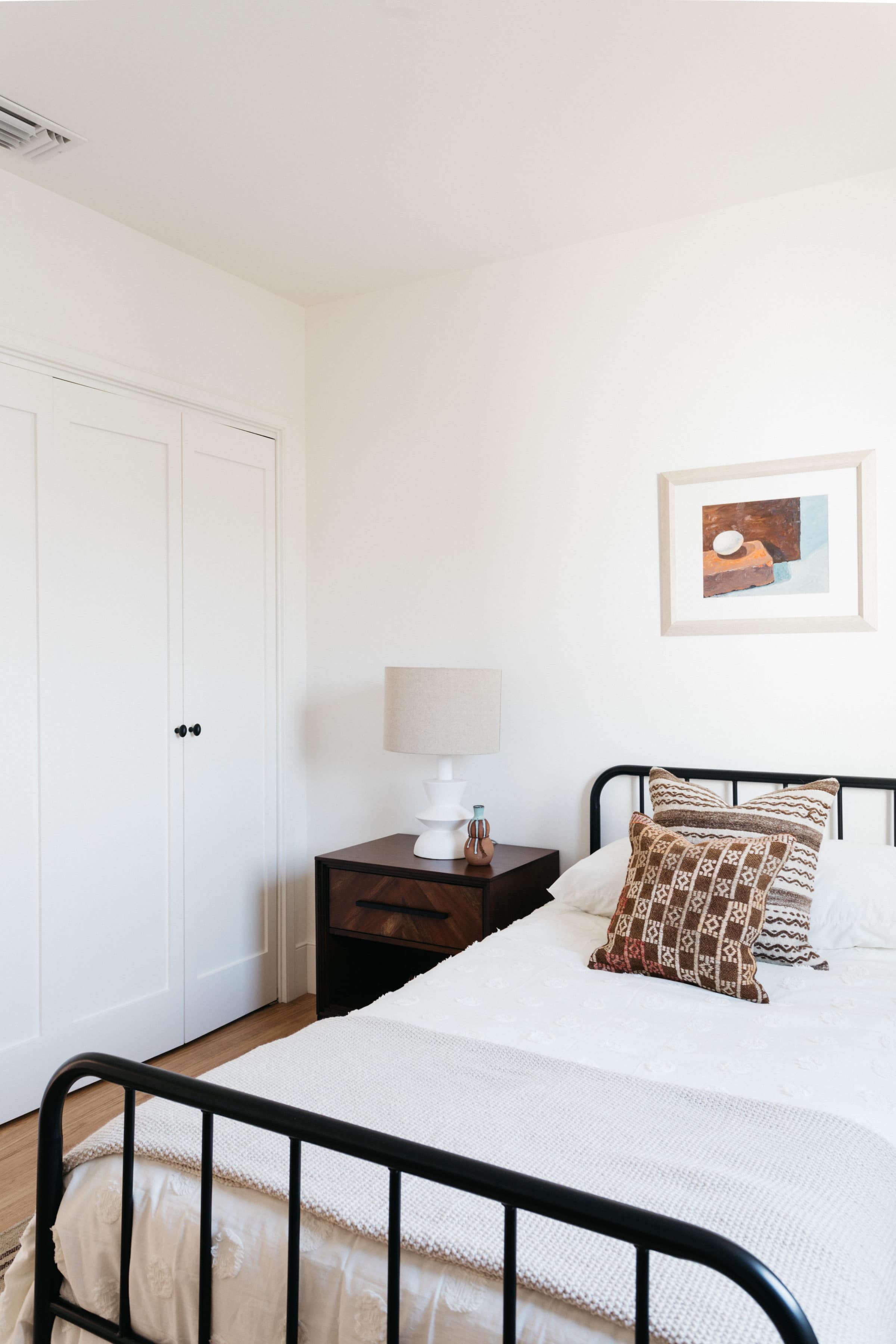 The master suite is a true escape, with a walk-in closet and en-suite bath with a dual vanity, soaking tub + separate shower stall. French doors add to the allure, opening to sprawling yard with mature avocado and fig trees.
