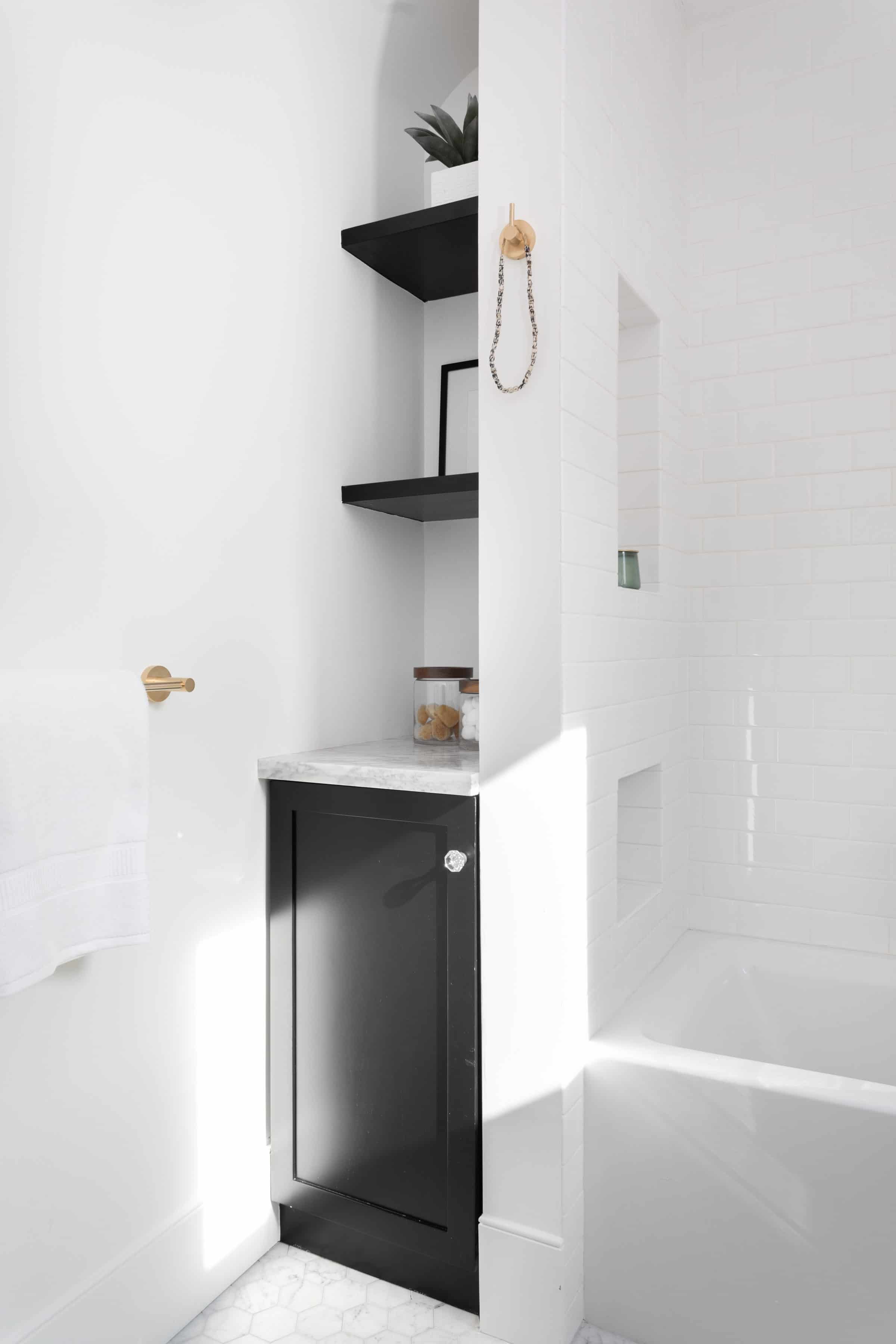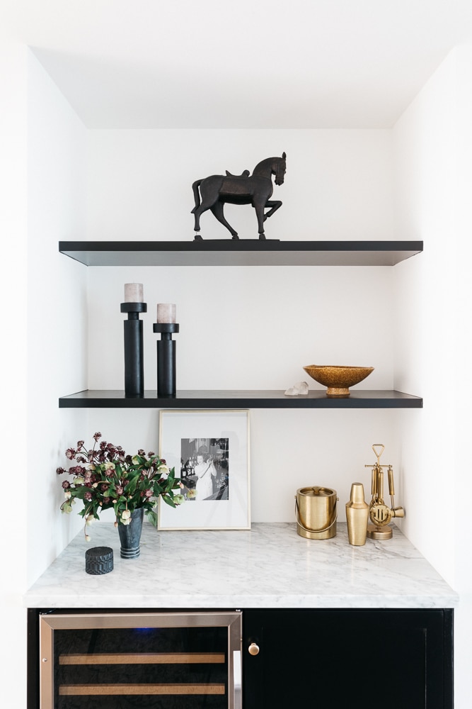 The chef’s kitchen offers tons of storage space + a breakfast bar with seating for six! Stainless steel Viking appliances are accented by marble counters, stark black designer fixtures and floating shelves. The formal dining room enjoys a storage cabinet as well, bonus: a built-in wine fridge – vino anyone?
