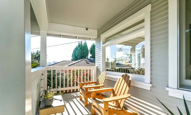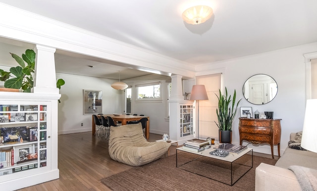 Inside, an elegant light-filled interior awaits. Warm hardwood floors flow throughout, and original built-ins and authentic details really bring the space to life.
