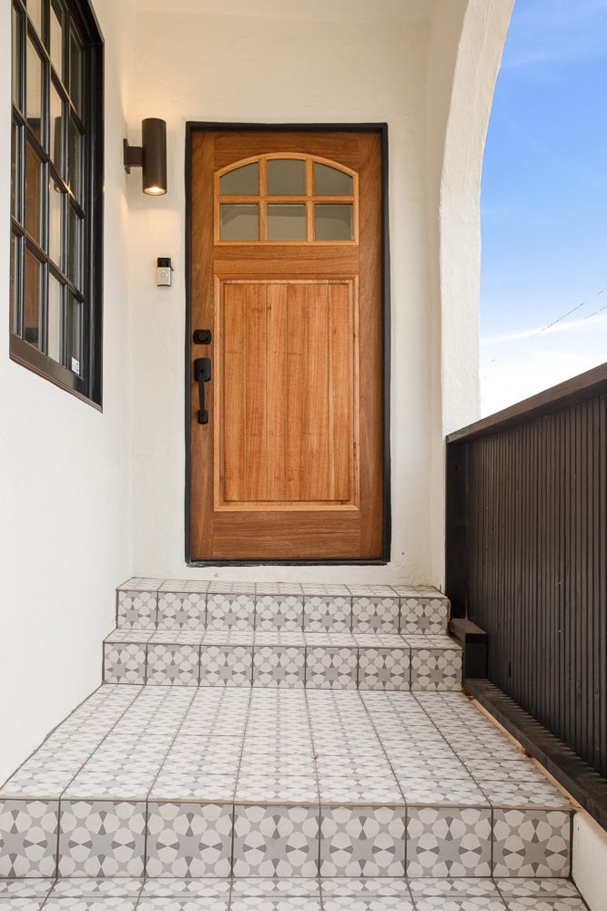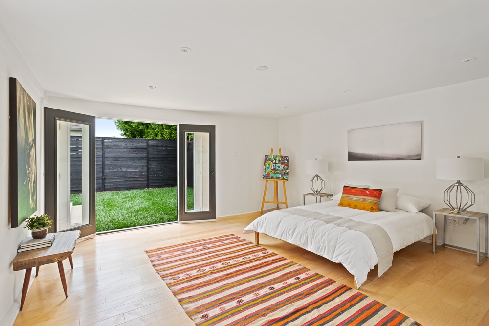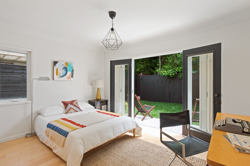 Back bedroom features French doors opening to fully tiled steps and backyard as well as a half bath with sliding barn door.