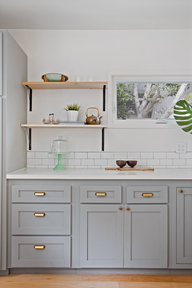 Living room leads to open concept kitchen and dining room highlighting custom painted cabinets, brass hardware, open shelving, stainless steel appliances and marble-look quartz countertops. Dining room sliding door opens to newly built side deck.