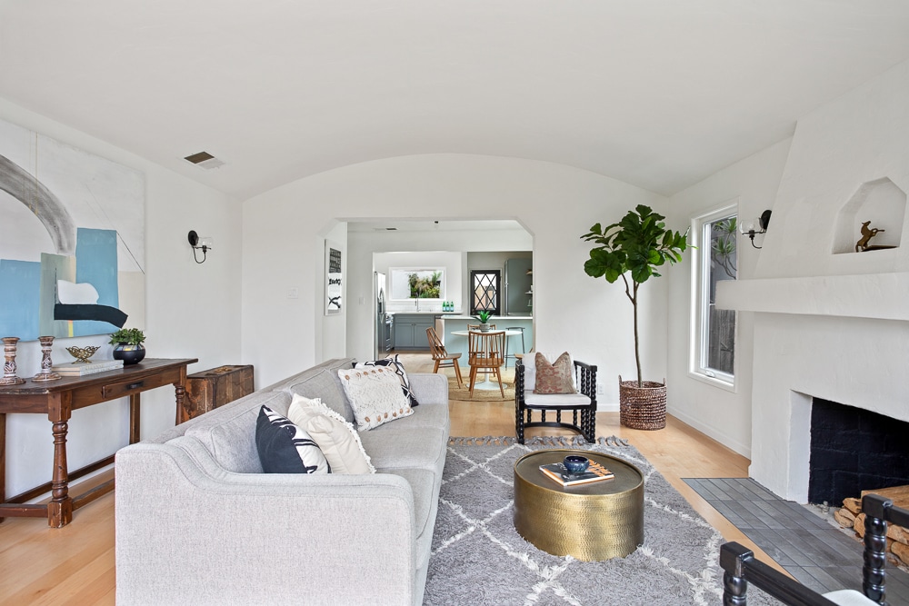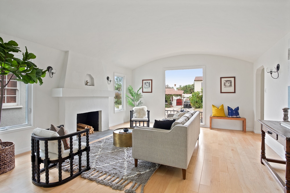 Walk up the tiled stairs and entryway and into the expansive living room which features a barrel-vaulted ceiling and original Spanish fireplace