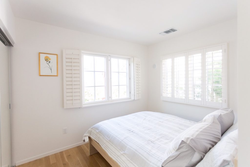 Solid oak floors, wood casement windows, and fresh white walls create a tranquil and bright space within both bedrooms. Added perks include the mindfully landscaped shared outdoor space, central A/C & Heat, and a deep soaking bathtub/shower combo.