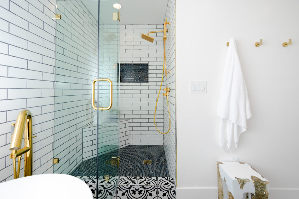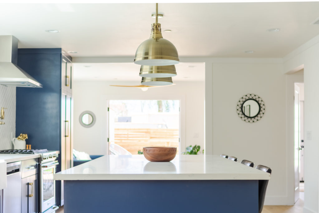 Enjoy ample seating in the dining area, open to the kitchen with an extended built-in island with seating for four. Bright custom cabinets are accented by brass details and fixtures, Quartz counters, white arabesque backsplash and built-in stainless steel appliances.