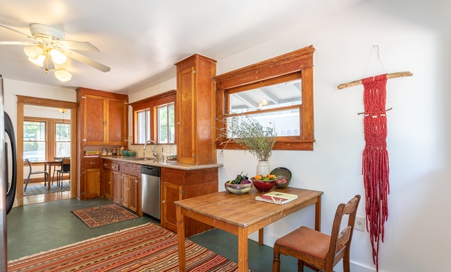 The classic kitchen, with shaker-style cabinets and linoleum flooring, opens to the flat yard, canopied by the shade of the Giving Tree (how awesome is that?!), holding court, with its own built-around wooden bench, the perfect contemplation spot.