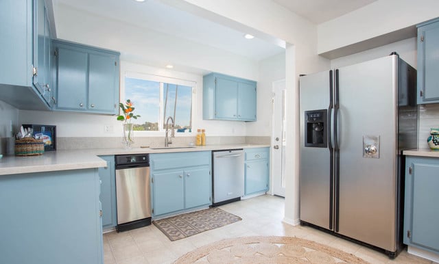 Kitchen is adorable with powder blue cabinets, stainless steel appliances and tons of counter space.