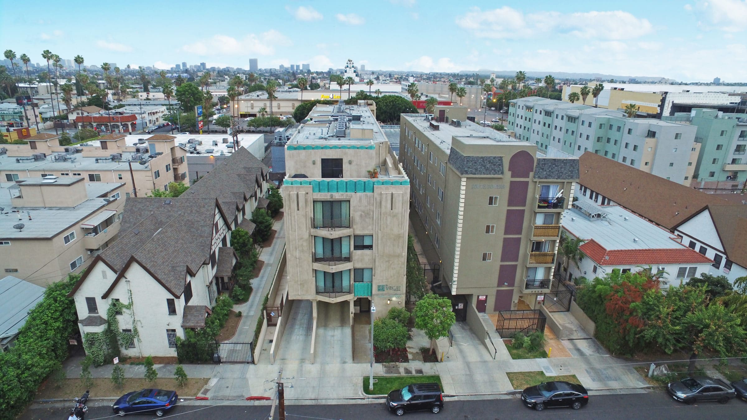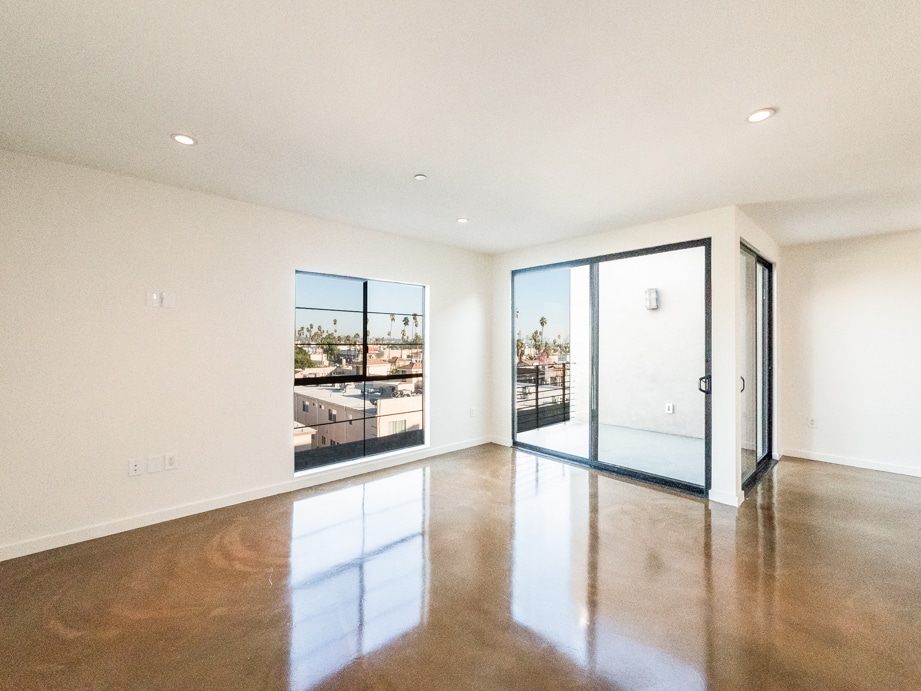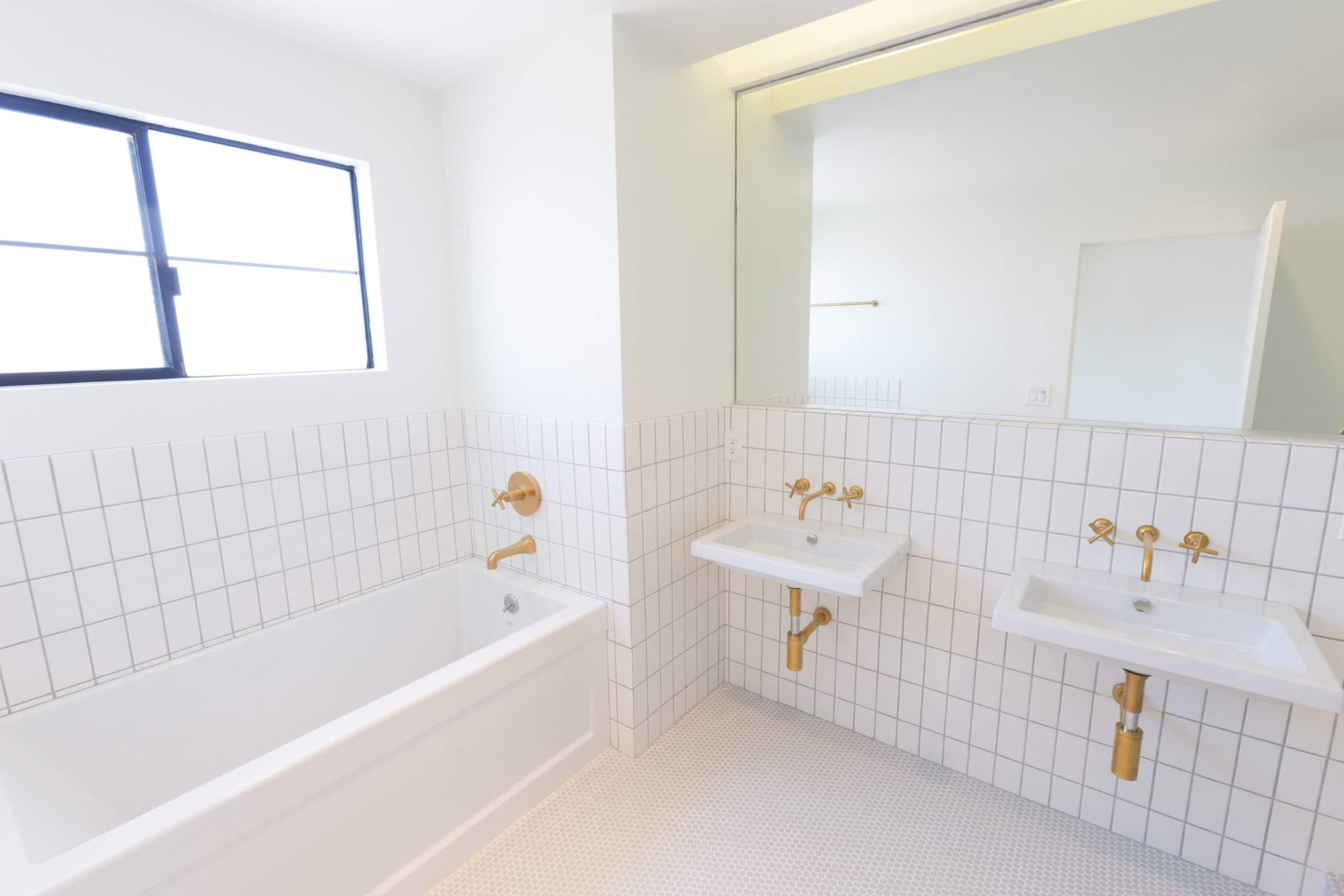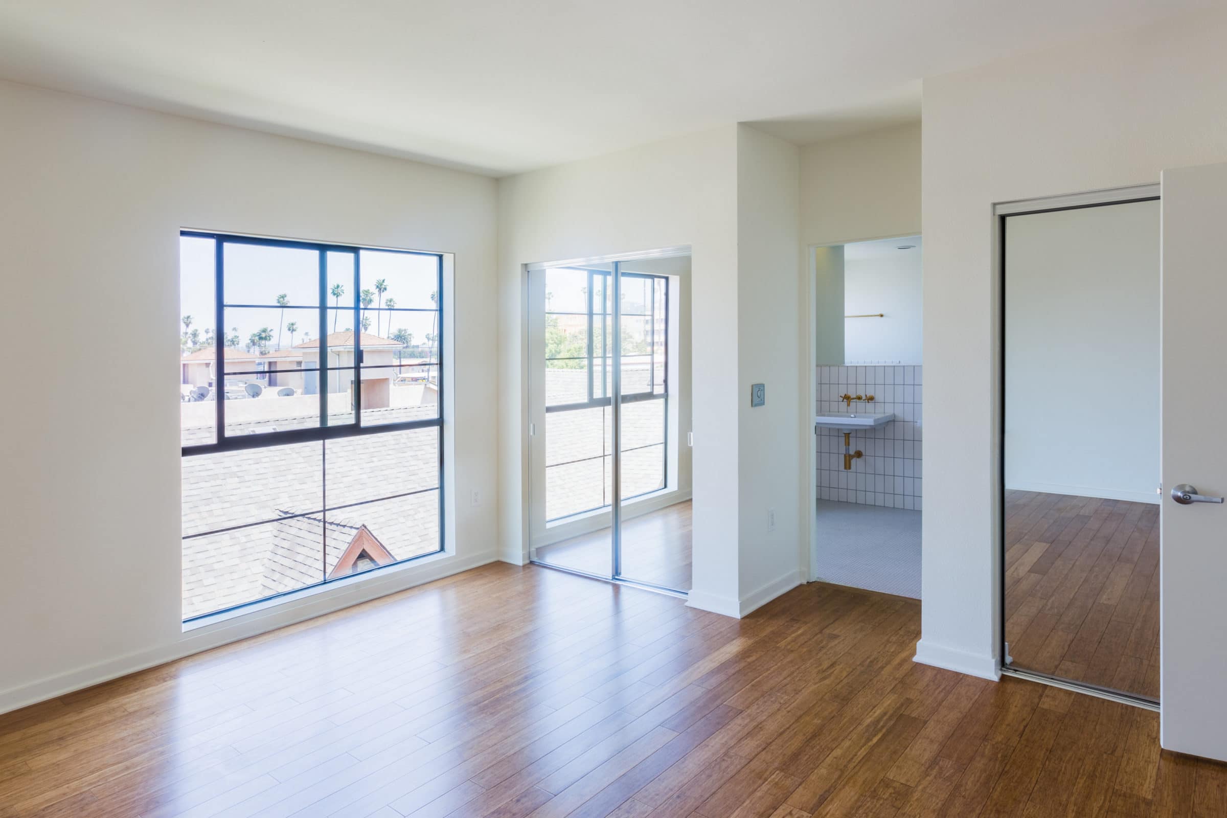Downstairs, each master ensuite has a completely updated bathroom. Designer finishes include sleek grey-penny tile, white-subway tile, floating sinks and gold fixtures, complete with soaker bathtubs and standalone showers. The unit has polished concrete floors upstairs and warm wood floors throughout the bedrooms. Situated in a prime location, between Hollywood & Sunset Blvd, just south of the Red Line station.