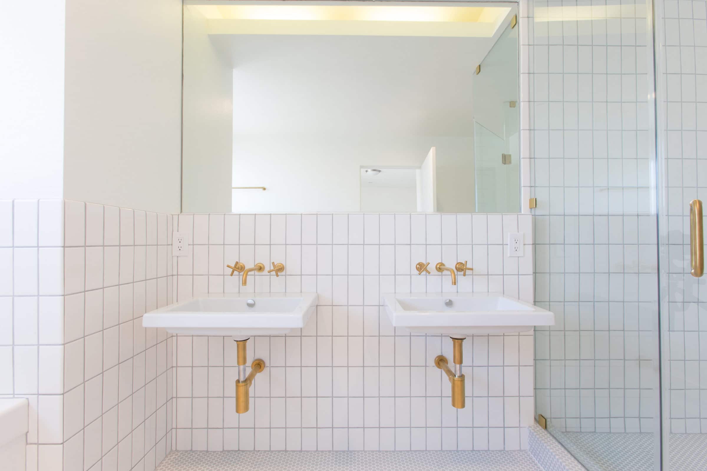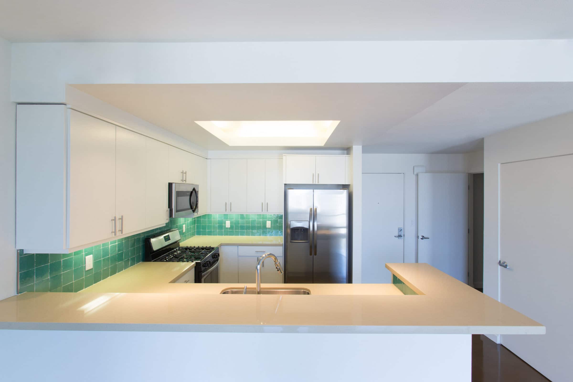 This unit recently underwent a complete renovation. The kitchen now features a beautiful, jade backsplash comprised of hand-made Mexican tiles. The pale, custom kitchen cabinets and ecru, quartz countertops reflect the light that streams in through the oversized windows and glass doors to the private balcony. The open concept floor plan brings the incredible views of Los Angeles into every area of the living space. Amenities within the kitchen include new, stainless steel appliances: a counter-depth refrigerator/freezer with ice machine, a four-burner gas stove and oven, a dishwasher, and range hood microwave. The half-bathroom adjacent to the living room features a floating sink with sleek gold fixtures, which make the jade-green tile surround pop.
