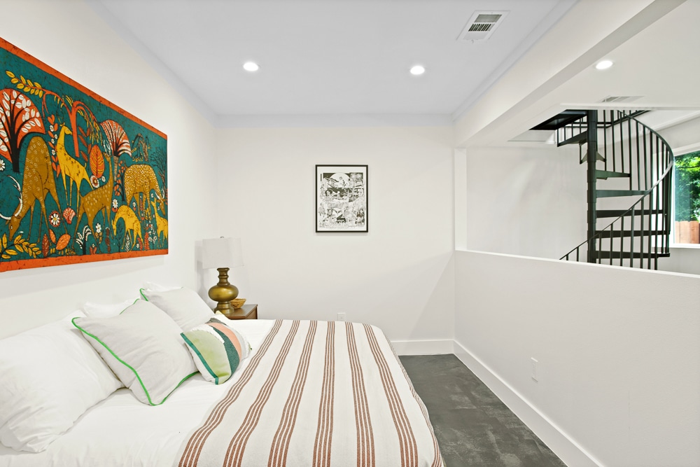 Step down the spiral staircase to the lower level, boasting an additional “bedroom,” renovated bath and living room!