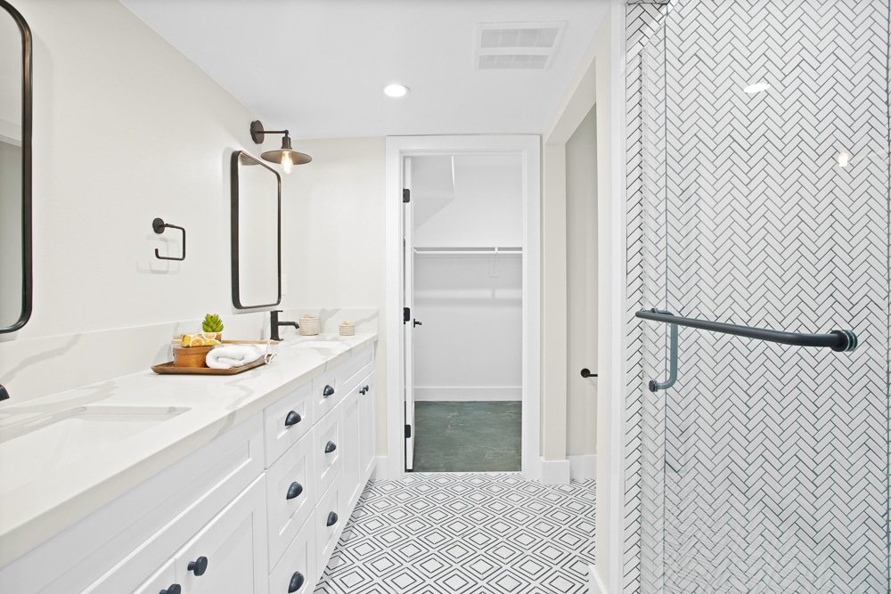 2 ample bedrooms share a bright and handsome bathroom, w/chevron tile shower and custom tile floors.