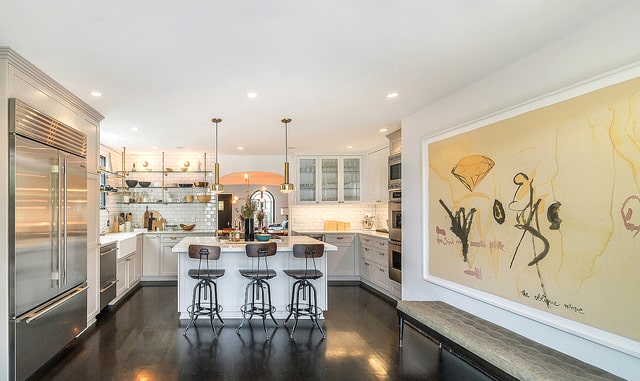 Kitchen is a chef’s dream and features beautiful countertops, farmhouse sink, open shelving, a large kitchen island and stainless steel appliances.
