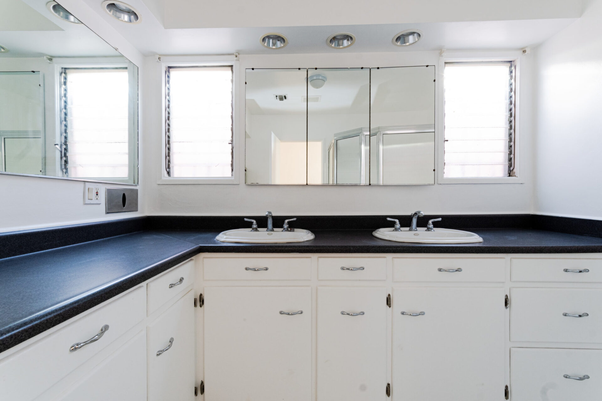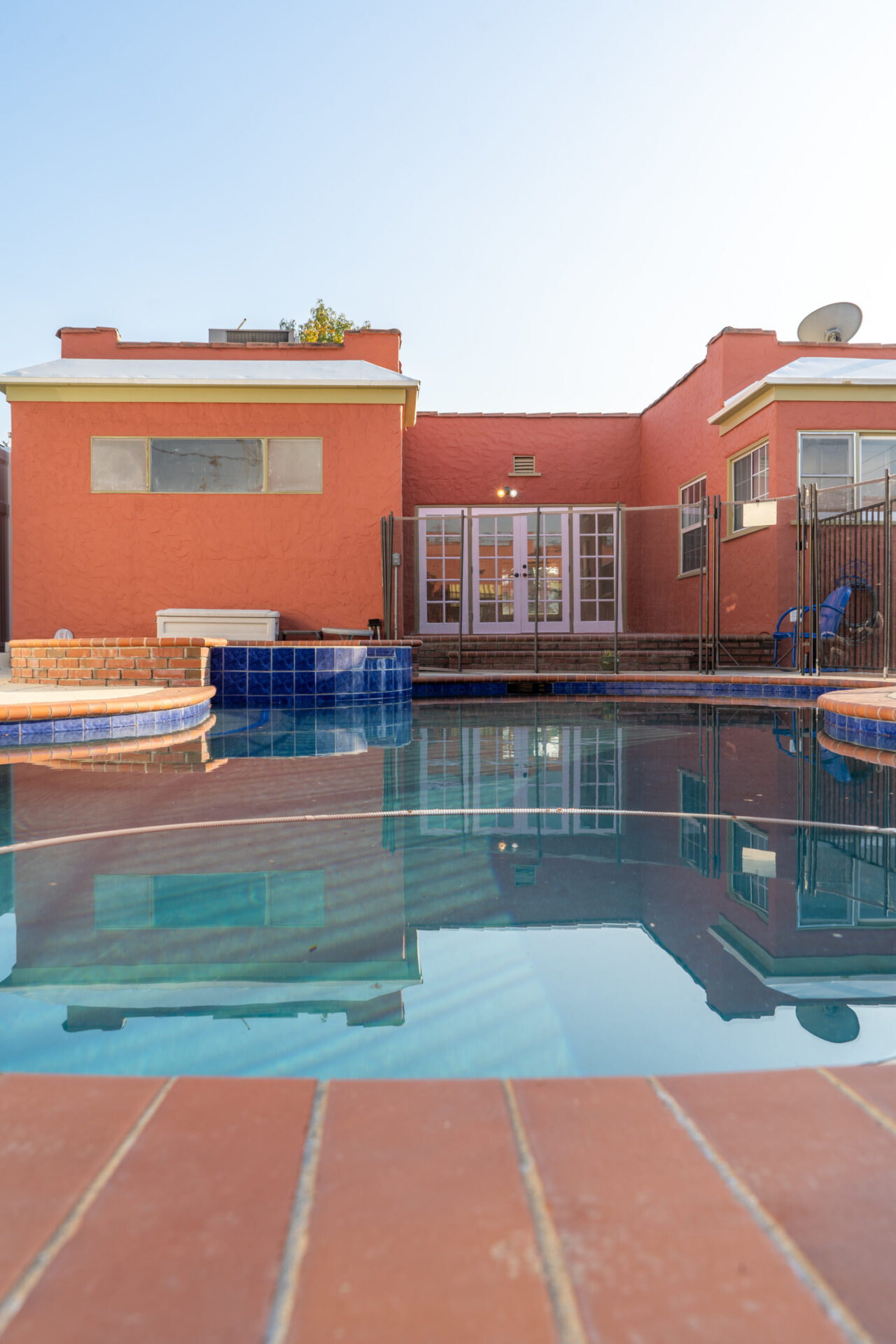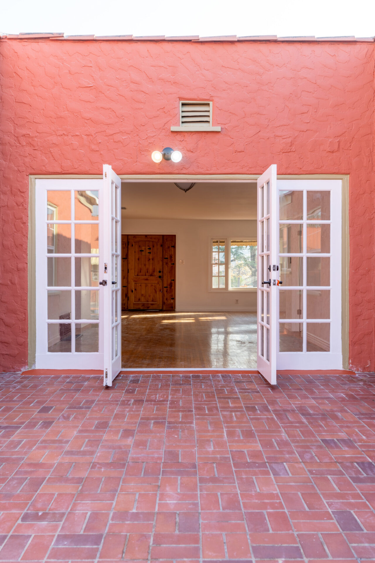 French doors to exterior private terrace overlook the saltwater pool and spa. Pool is shared by front and back houses. A bonus pool bathroom is available in garage.