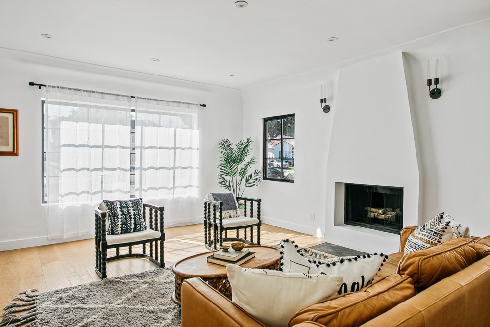 Solid wood double doors with sleek black Emtek hardware open to a formal entry, revealing inside a spacious sun-bathed living space. High ceilings, recessed lights and new black Milgard windows emphasize warm engineered hardwood floors throughout. With fall upon us and winter soon approaching the gas fireplace presents the perfect setting for cozy nights in.