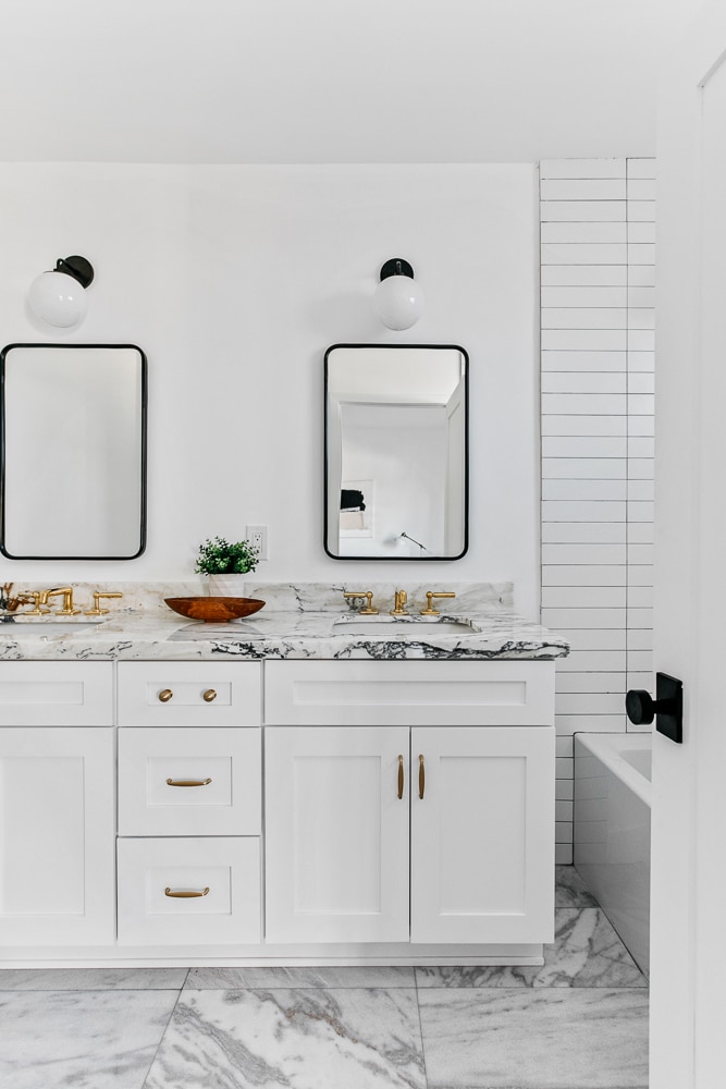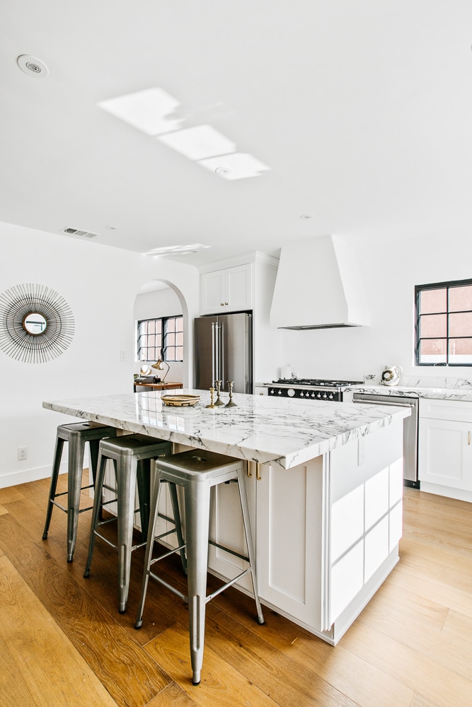 Flow through the functional floor plan from an open dining area into the bright custom kitchen. Upscale stainless steel Bertazzoni Heritage series appliances are wrapped in white cabinetry + gold Calacatta marble counters – so luxe!