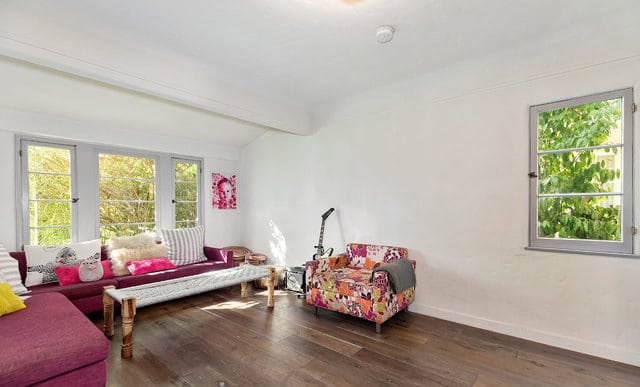 Inside, stained white oak floors flow throughout, and a bright living room with beautiful coved ceilings greets you upon entry.