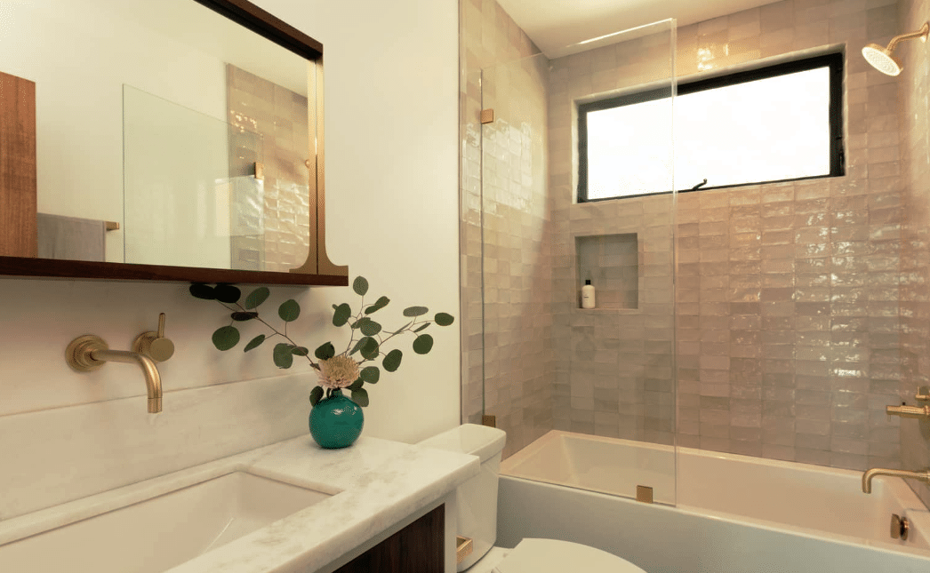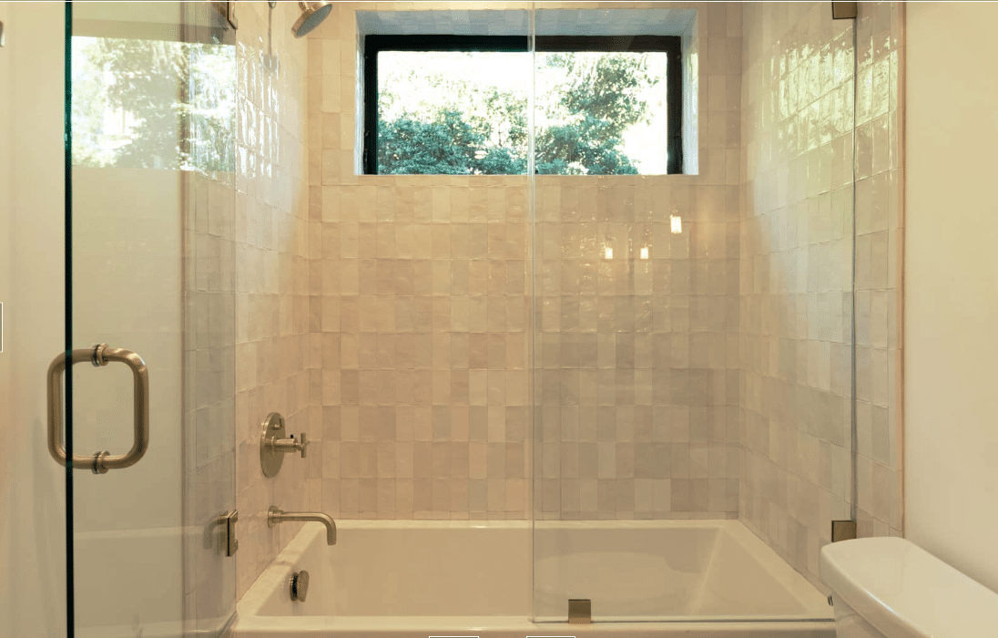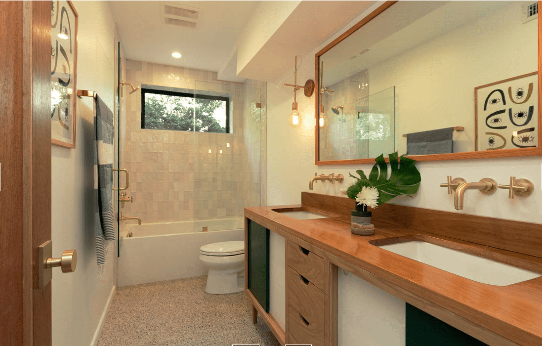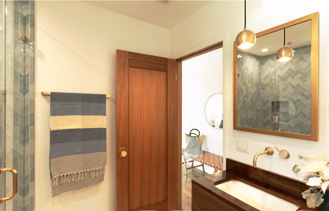 The walnut countertops mixed with the blue herringbone shower tile are delightful.
