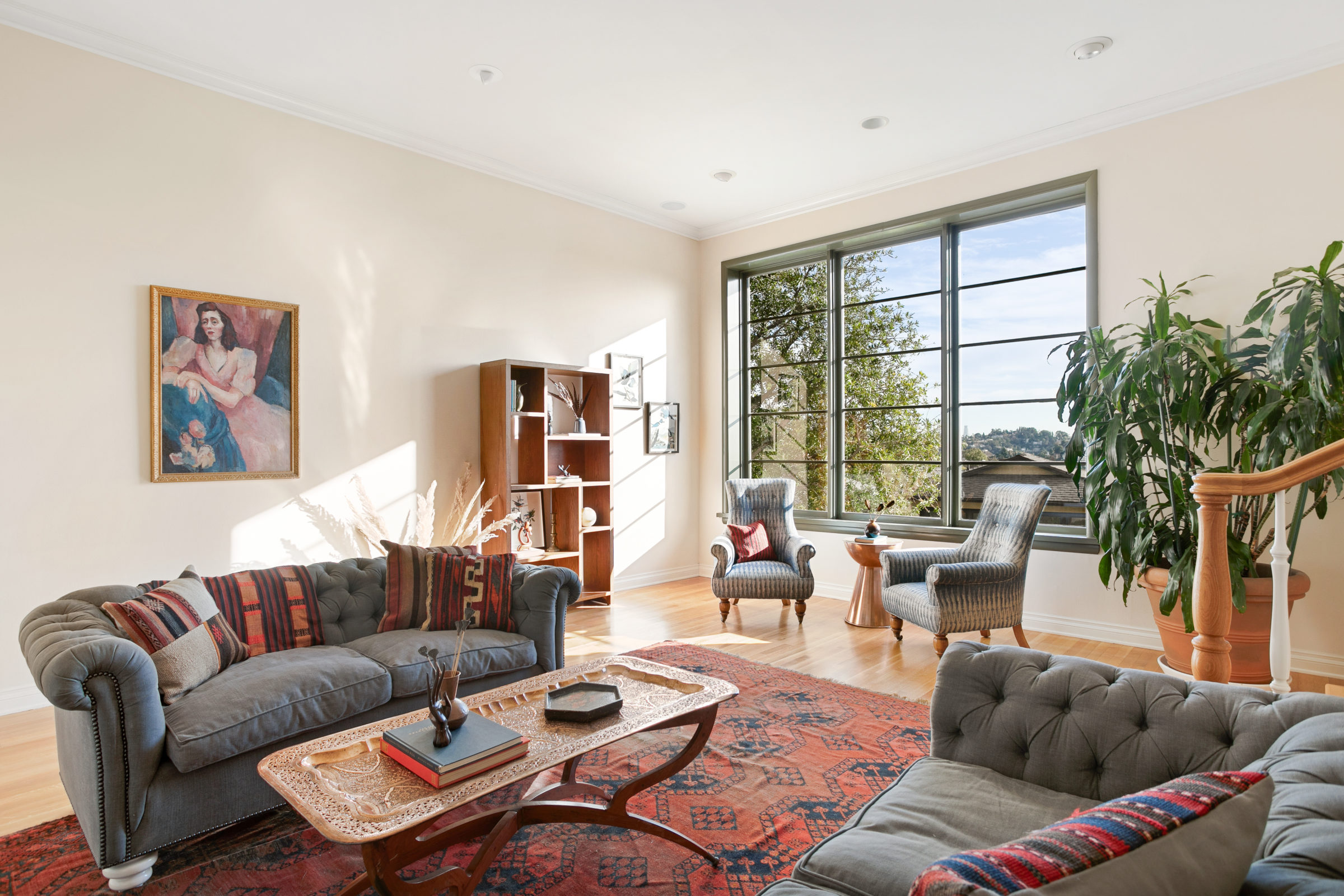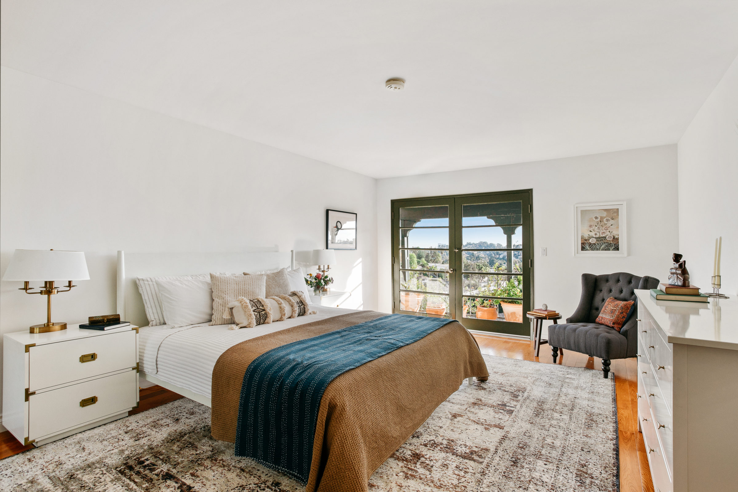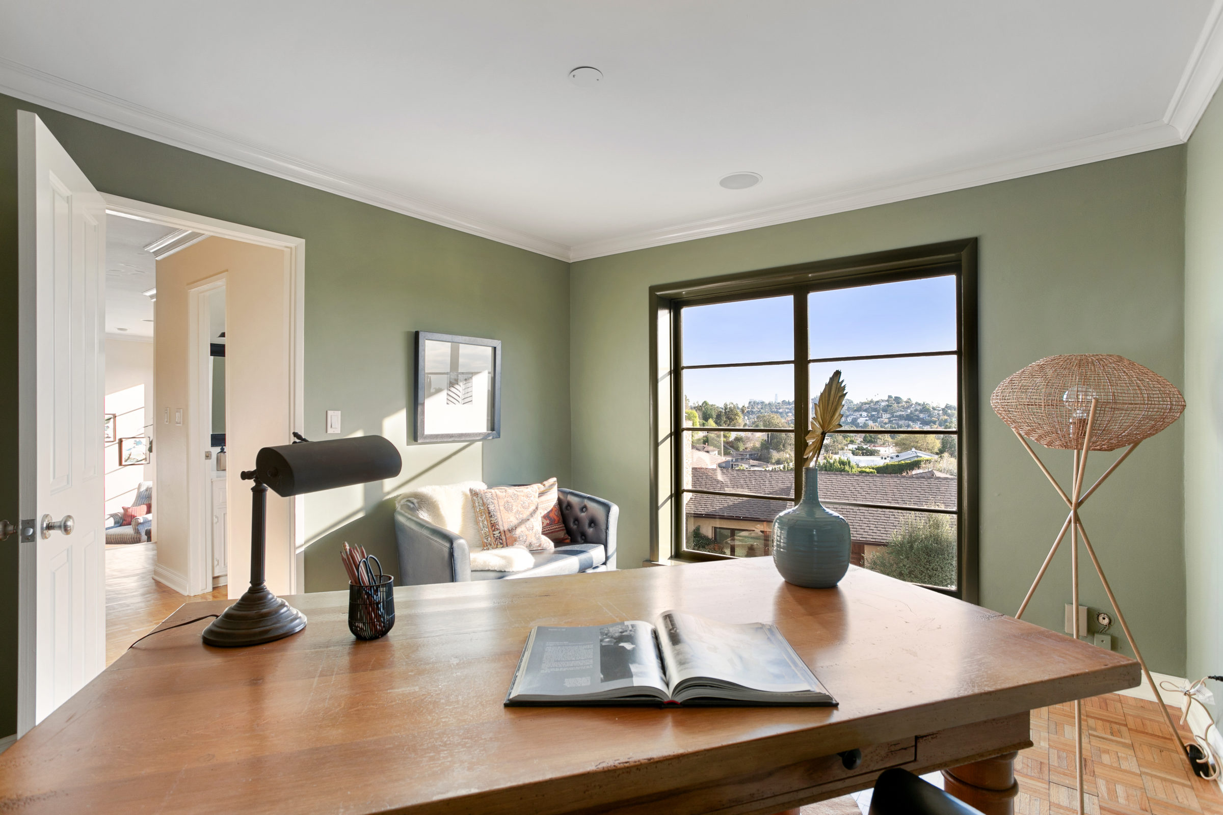 Large French casement windows showcase stunning views of the Los Feliz Hills and DTLA’s skyline from the living room and five other rooms of the home….