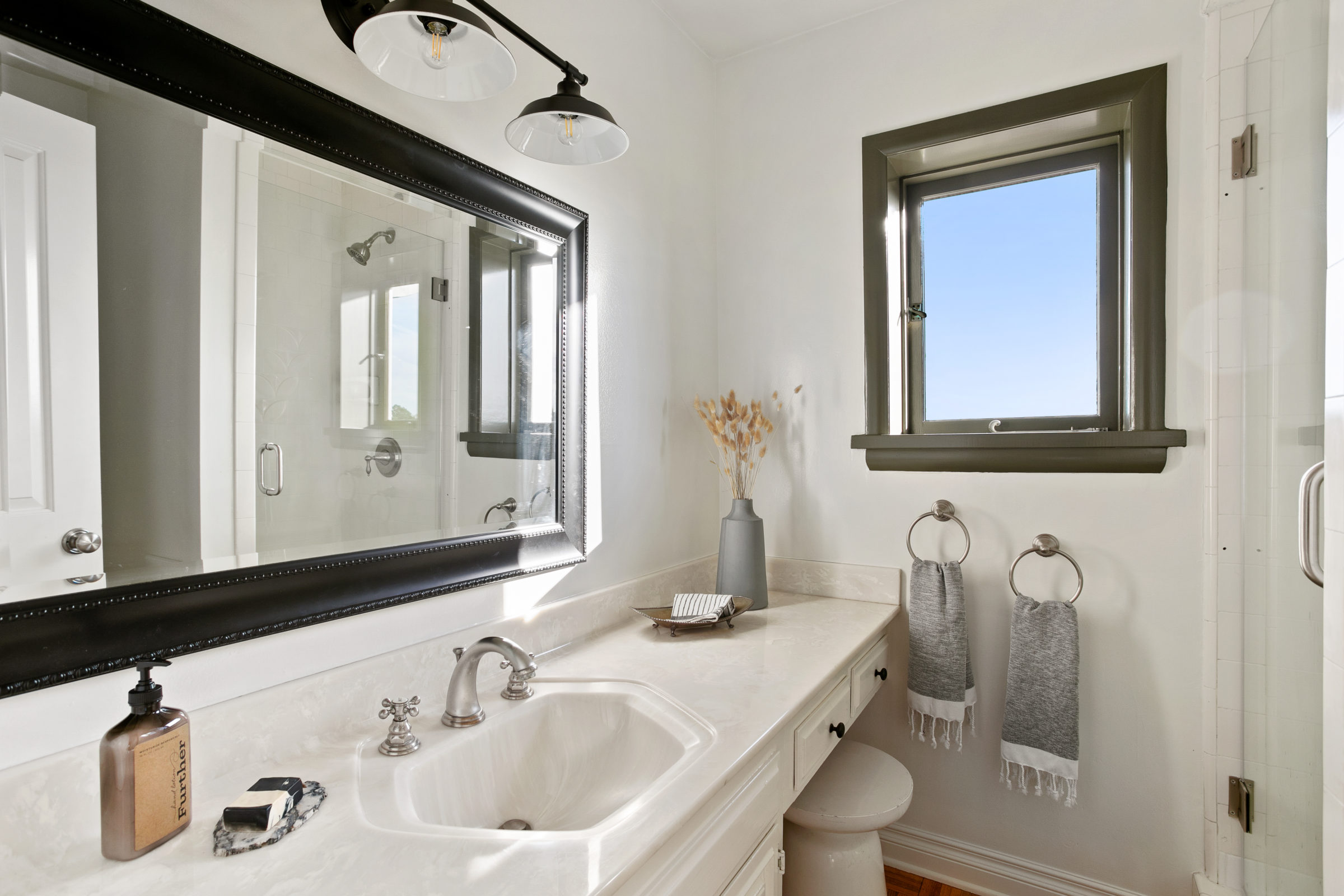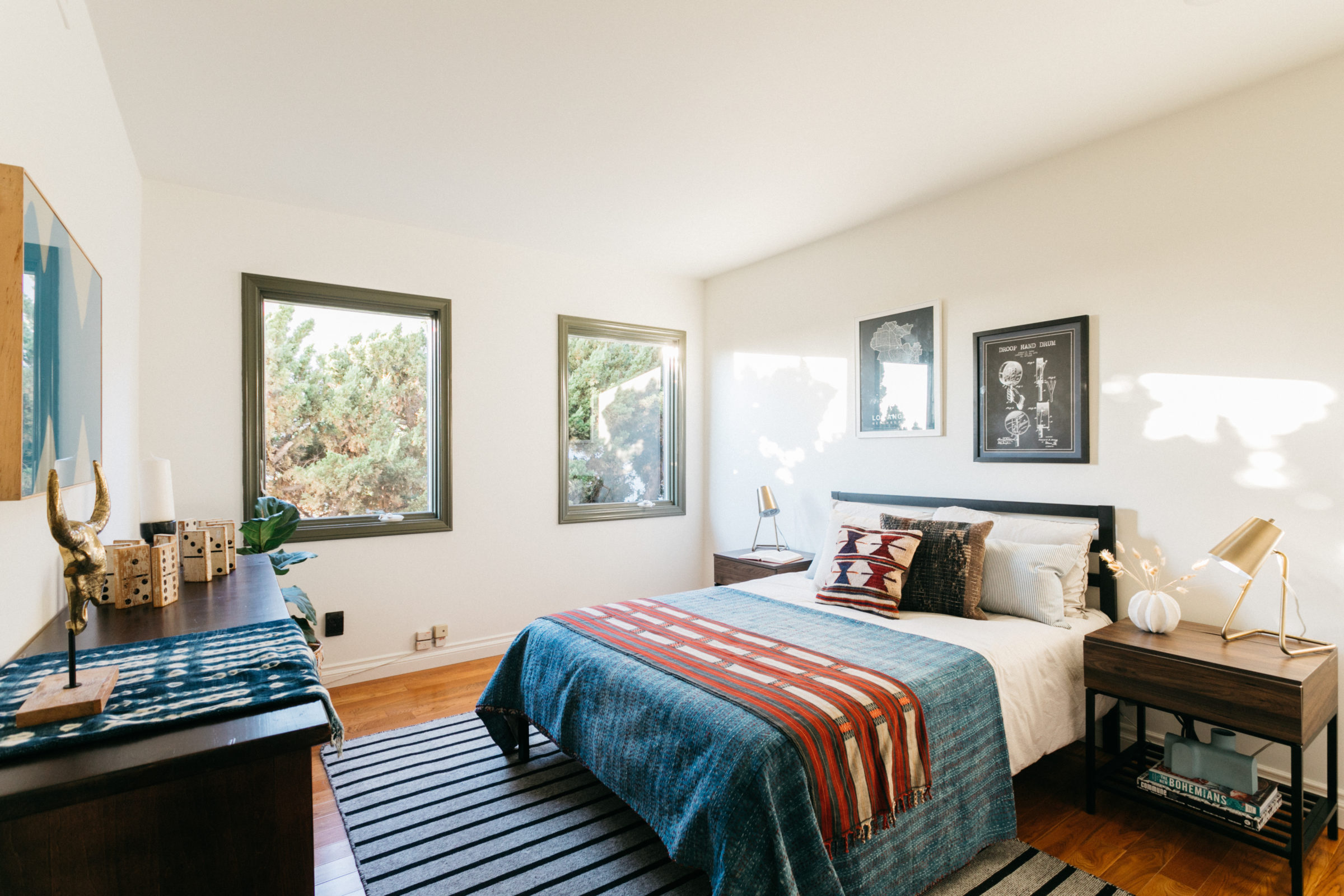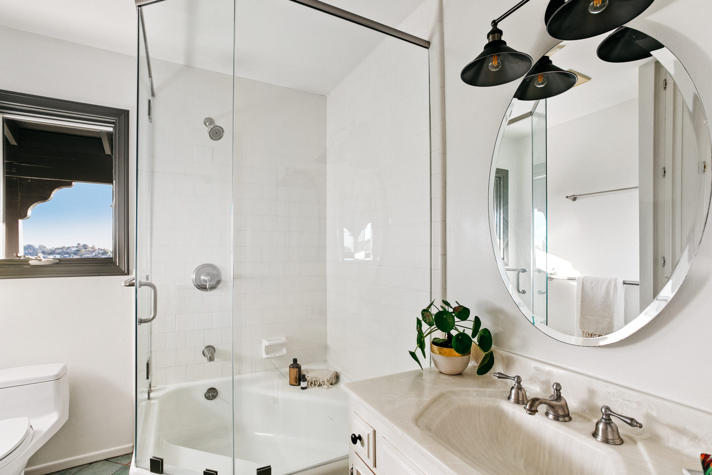 Large French casement windows showcase stunning views of the Los Feliz Hills and DTLA’s skyline from the living room and five other rooms of the home….