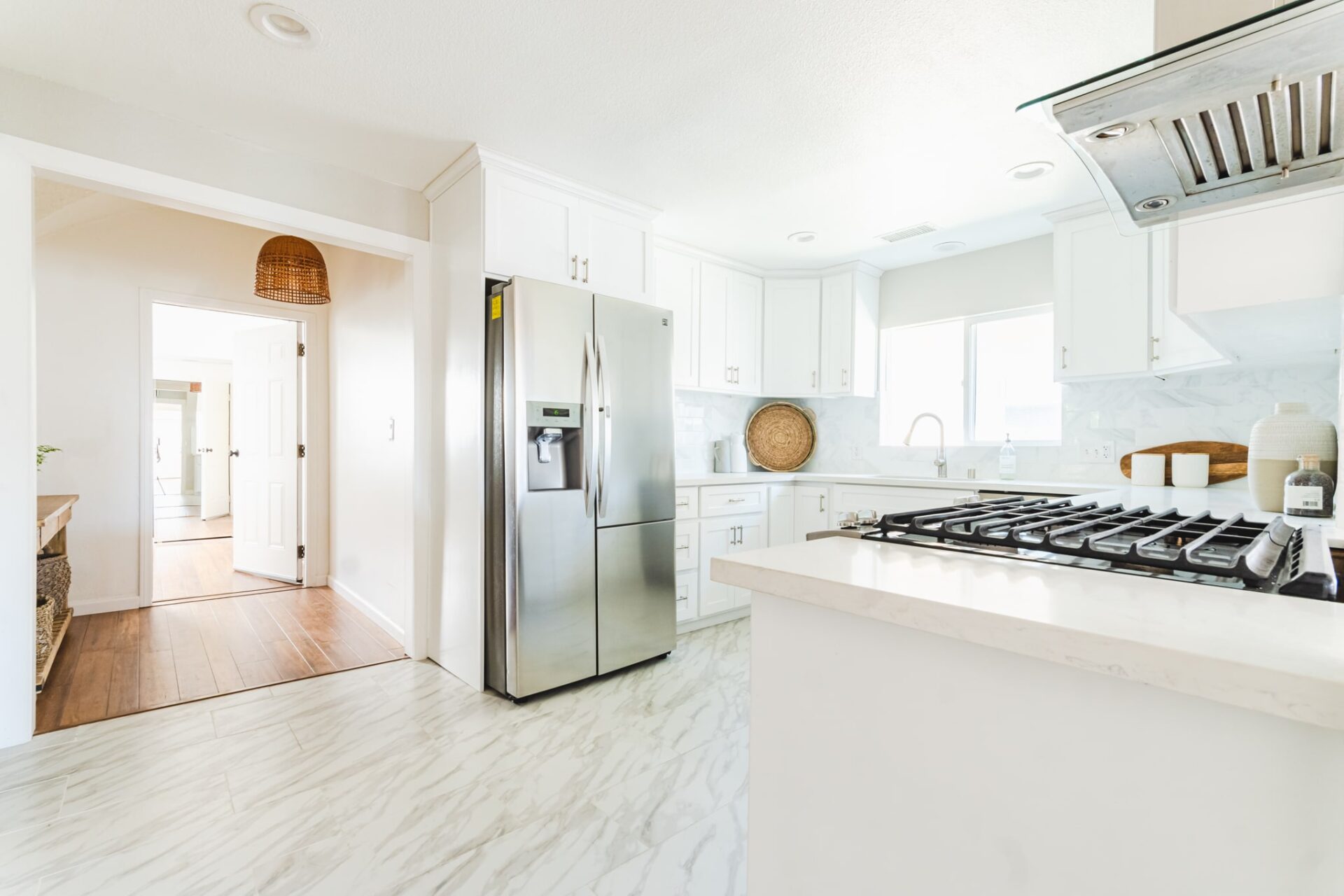 Modern kitchen features quartz countertops, new cabinets, and new stainless steel appliances.