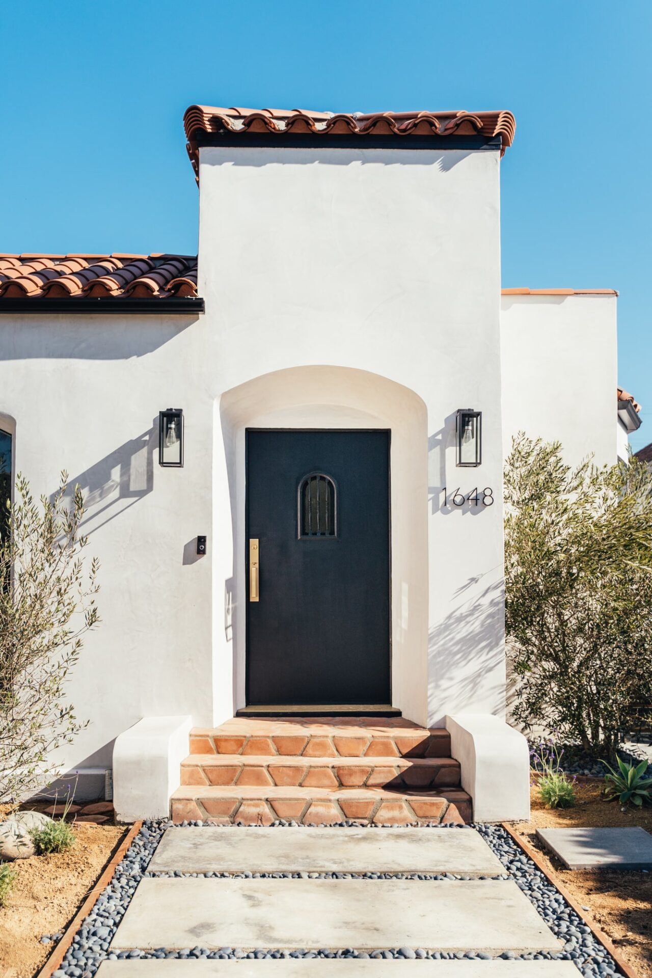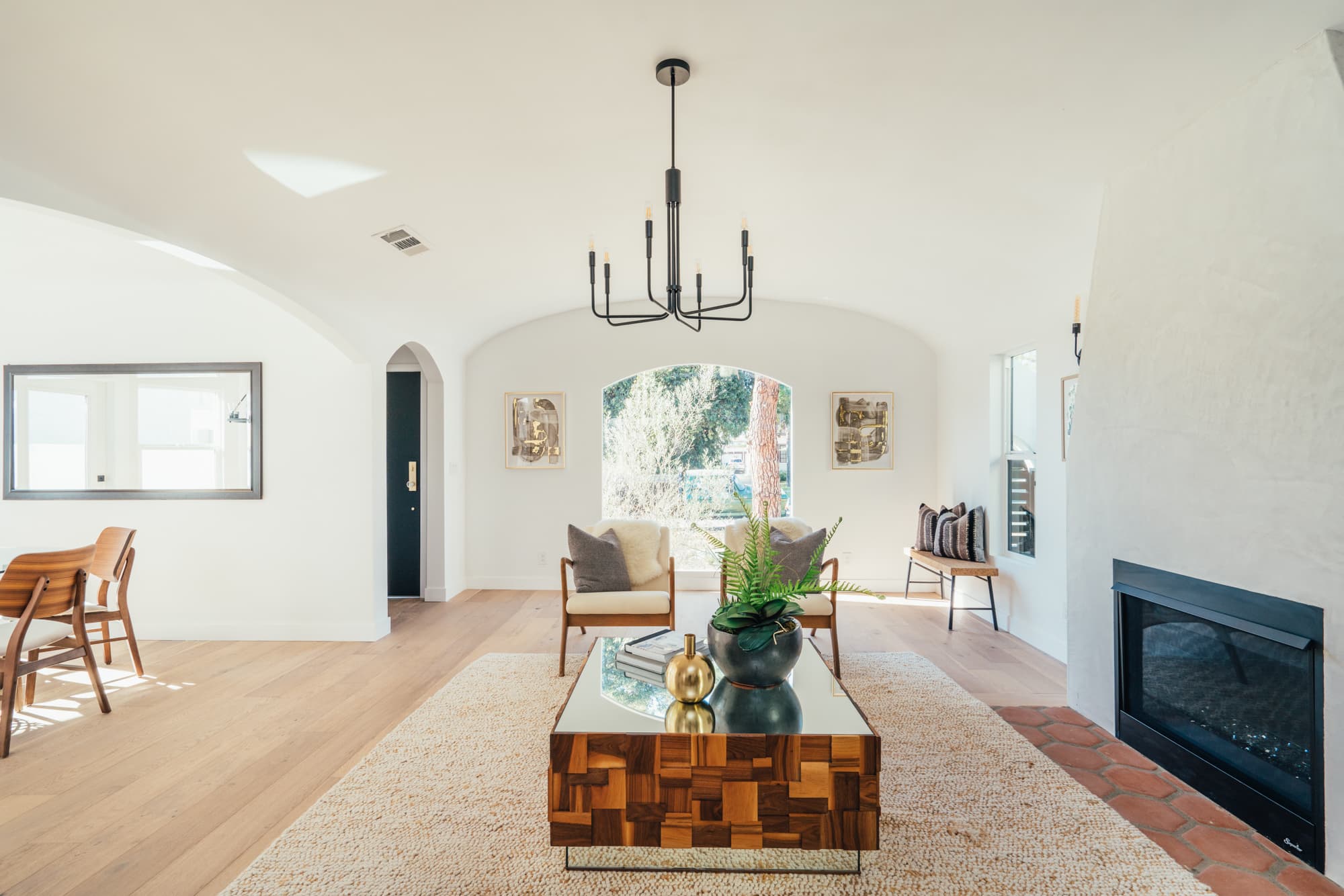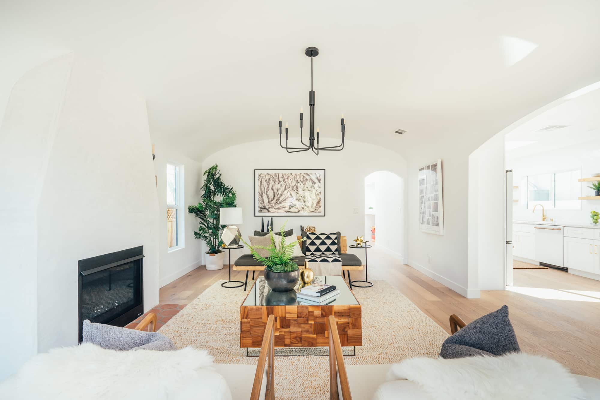 Barrelled ceilings tower over new wood floors and a new gas fireplace with a smooth stuccoed mantle. The living space opens to the kitchen and dining, creating a flow perfect for spending quality time together. New black designer sconces and charming new Emtek doorknobs continue the modern spin on character touches throughout.