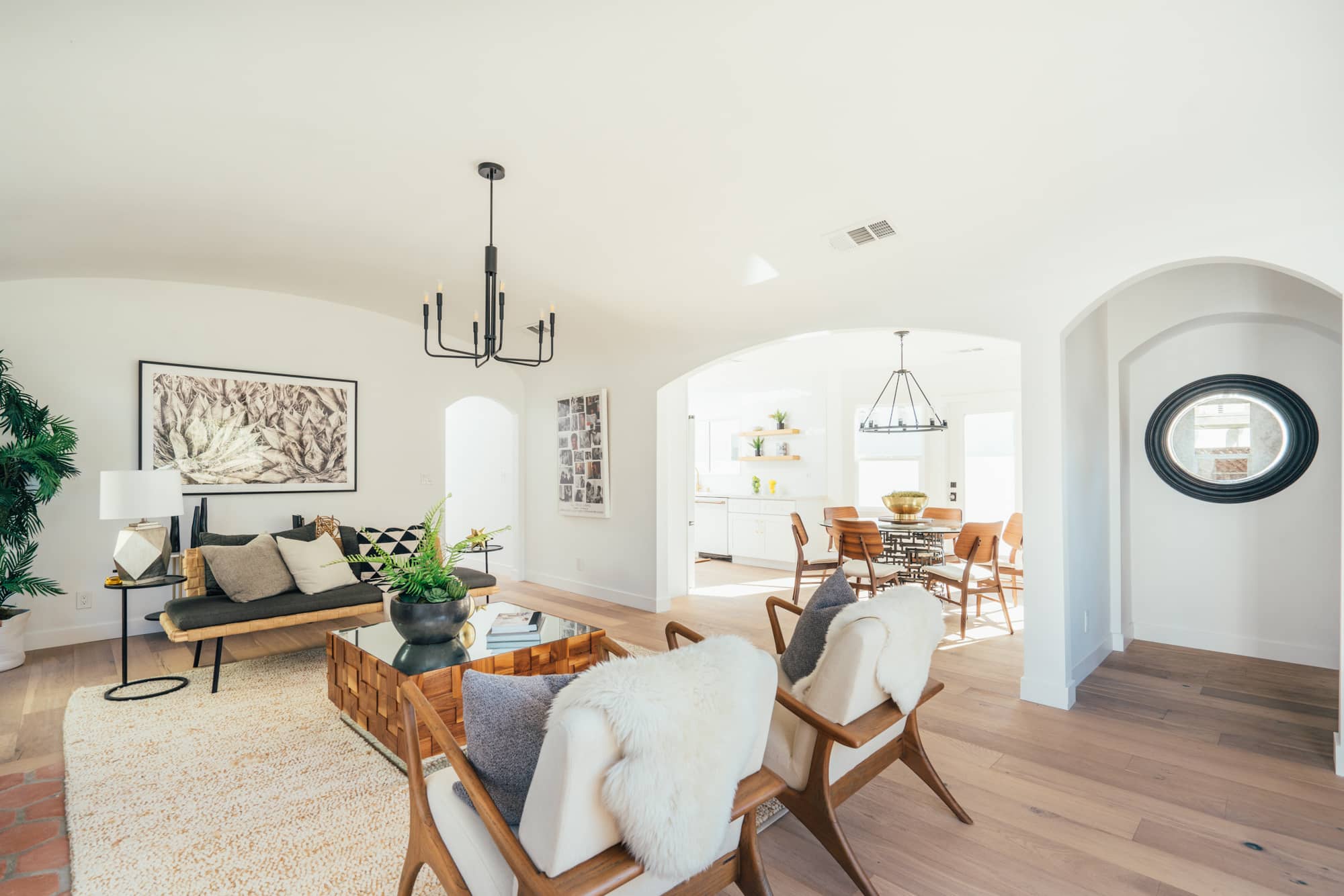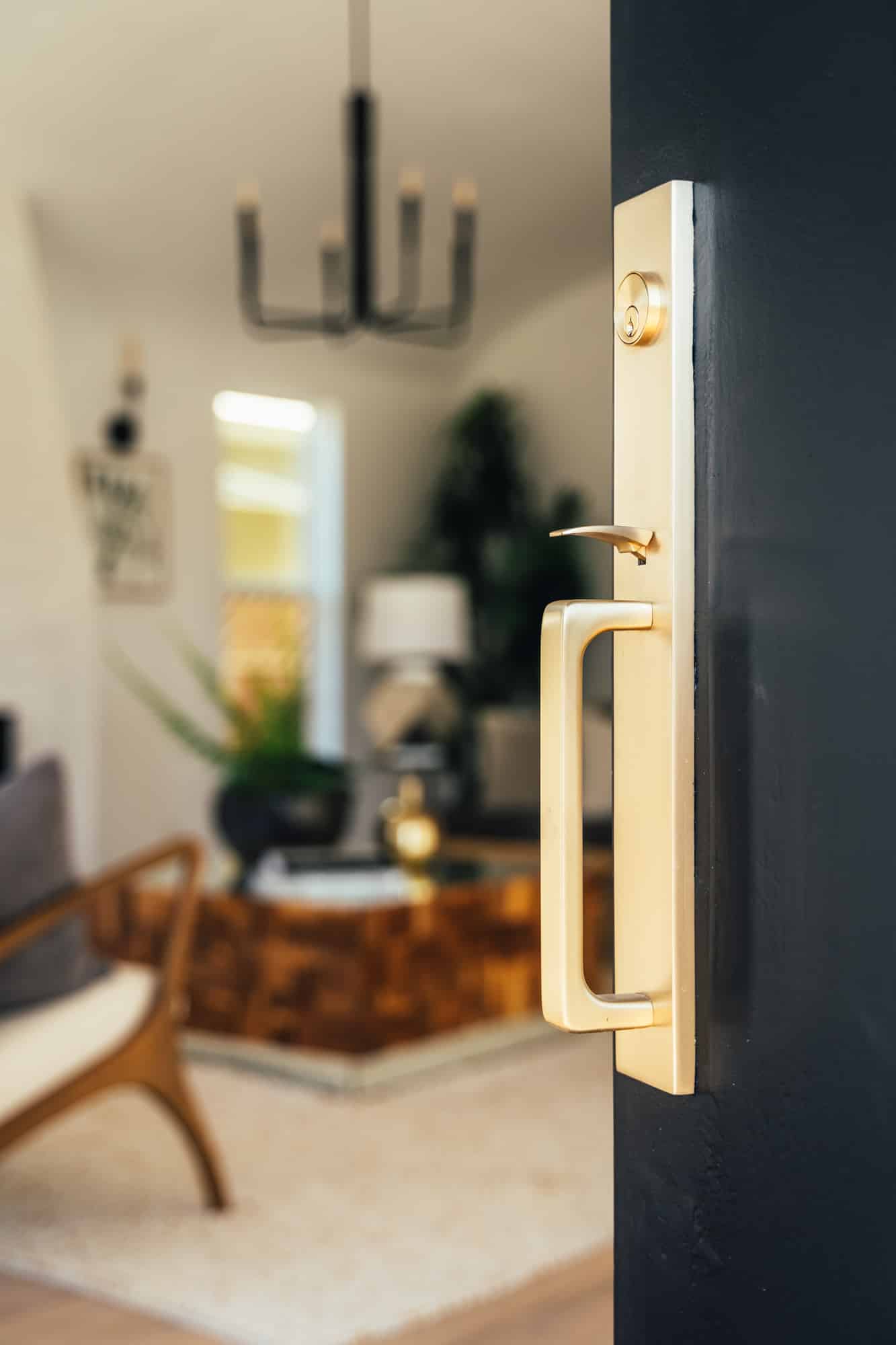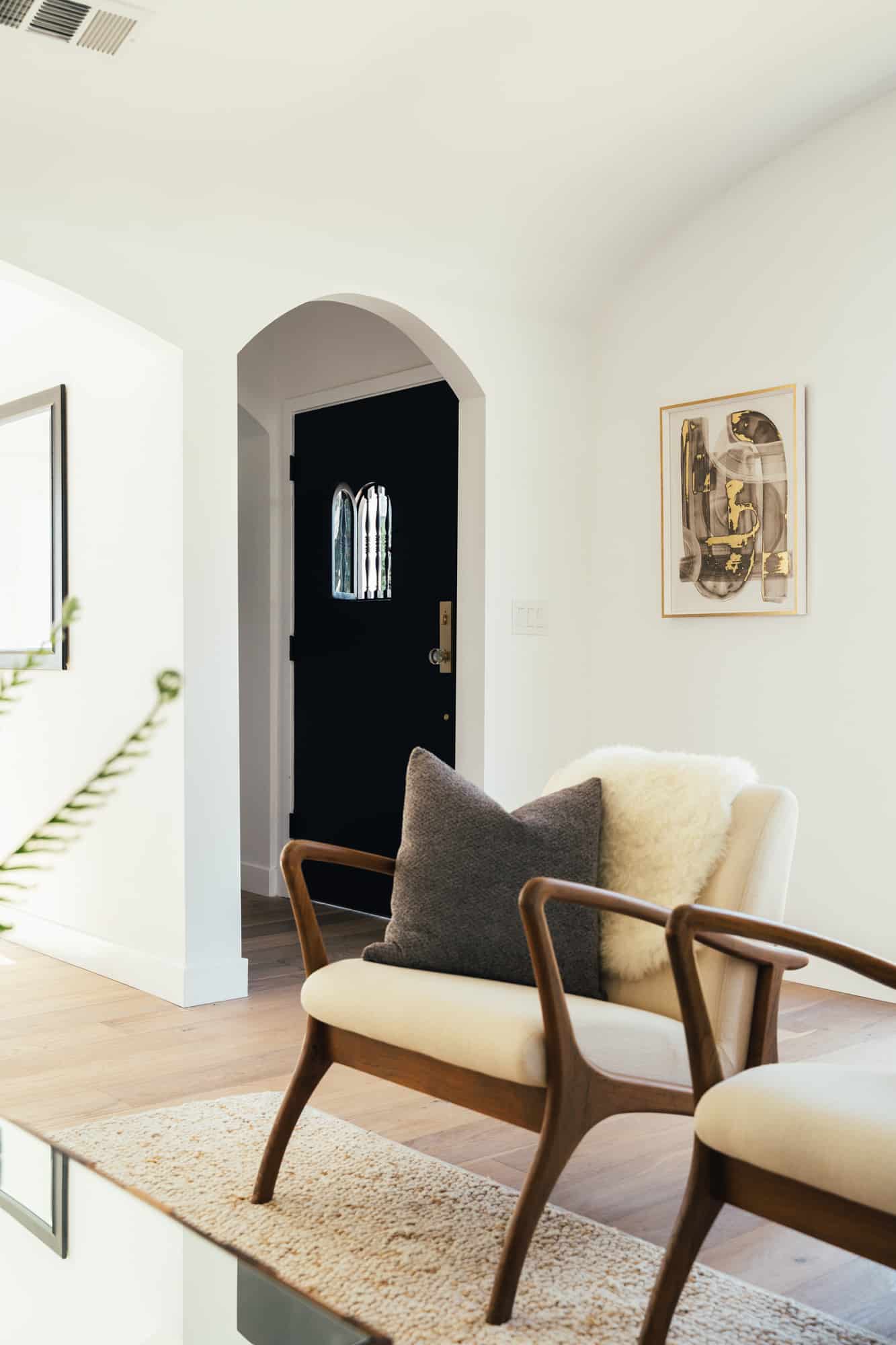 Enter the thoughtfully curated space through a solid front door garnished with Emtek hardware and a peephole with a decorative grille. An archway leads from the formal foyer to the living room.