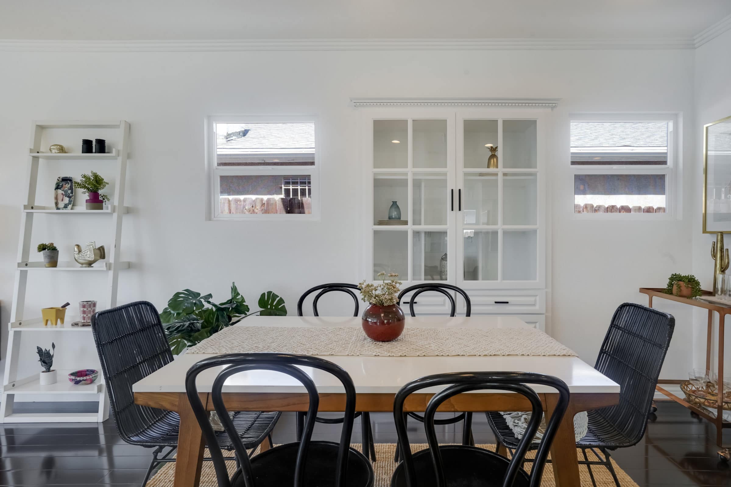 Enjoy family dinners in the dreamy dining area with built-in cabinetry, looking onto the updated kitchen boasting sparkling granite countertops, see-through cabinets, pendant light and matte black hardware.
