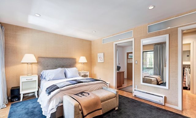 This leads to the master bedroom WITH CORK FLOORS and and grasscloth wall covering as well as another balcony.