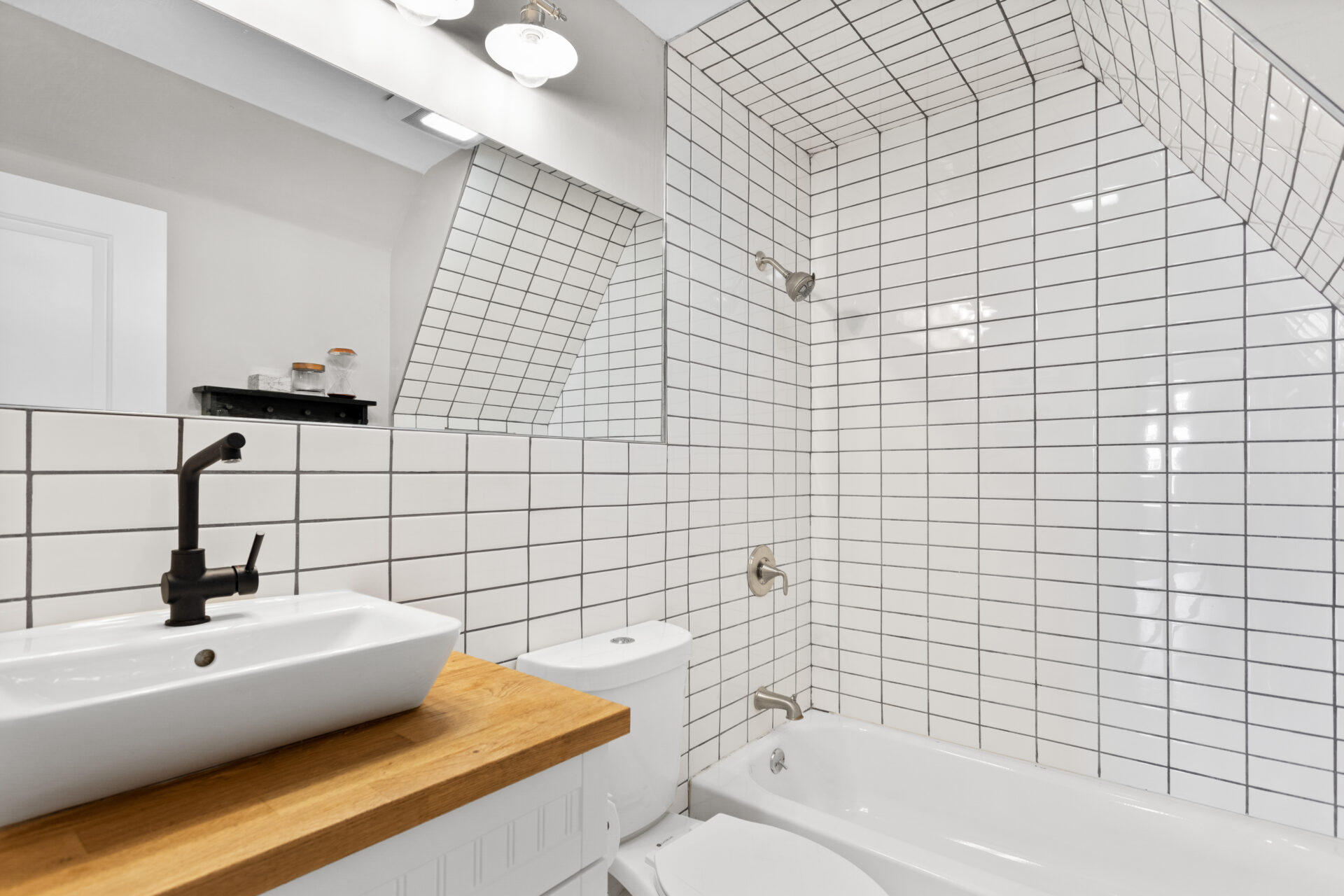 A renovated full hall bath with subway tile detail and shower over tub is easily accessed via main living space.